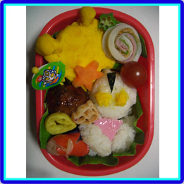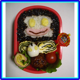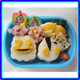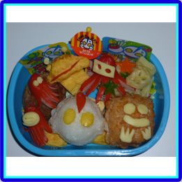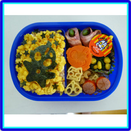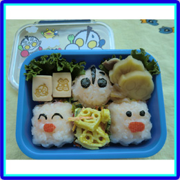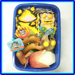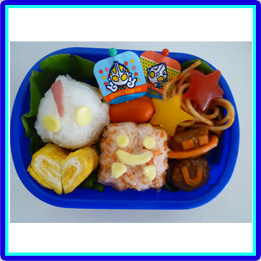 ウルトラマンとピグモンはにぎにぎおにぎり型でつくりました。カネゴンは玉子焼きでつくり、目はパスタでさしています。ウインナーで作ったのは、タコさんではなくて宇宙人のお友達です。 |