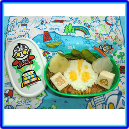 のりのりパレードとふりかけまーちを使うだけですが、ウルトラマンのお弁当になります。忙しい朝には助かっています。 |