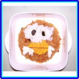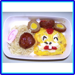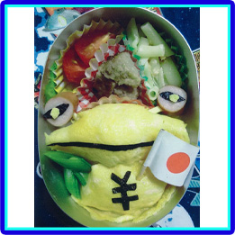 顔の部分はバターライス、目玉はミートボールとウインナーを使い、薄焼き玉子で包みました。ウインナーハムでウルトラマンを作り、お金に見立ててます。" |