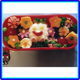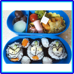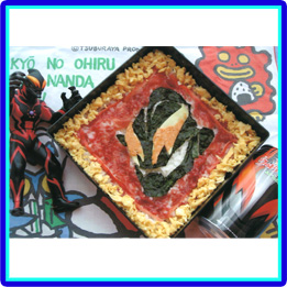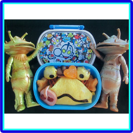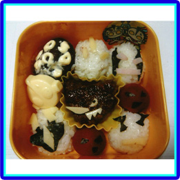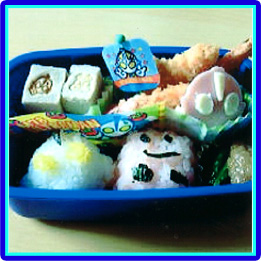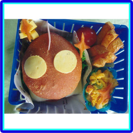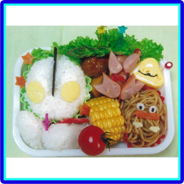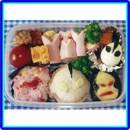 ゴモラのハンバーグを真ん中に右上から時計回りにダダ、プチトマトのノーバ、エレキングおにぎり、ノーバ、ゼットンおにぎり、ウルトラマンチーズ、タッコングしいたけ、ニセウルトラマンおにぎりが勢ぞろいしたにぎやかなお弁当を作ってみました。 |