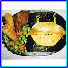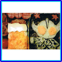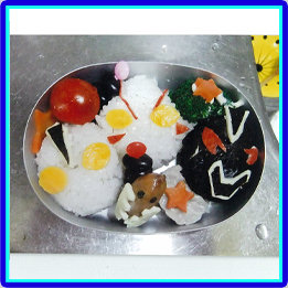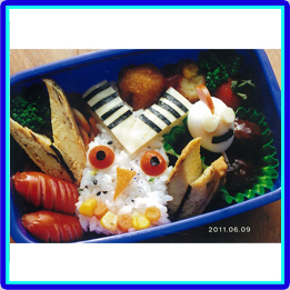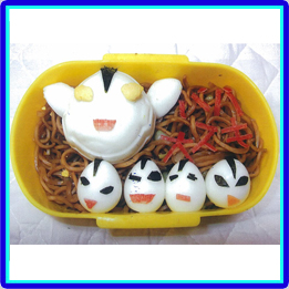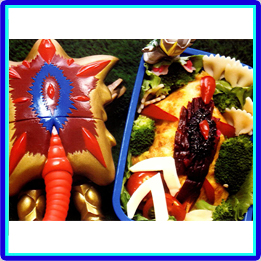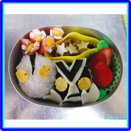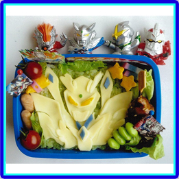 バルタン星人のハサミをエビフライでカラフルに。うずら卵で作った、ウルトラマンは、光線ポーズをしています。玉子焼きをカネゴンの型にするのに少し苦労しました。ベリアルも表情が優しく楽しいお弁当が出来たと思います。 |
