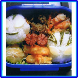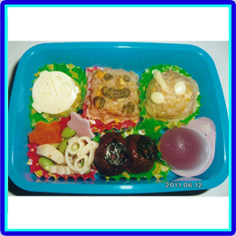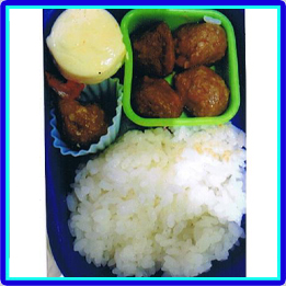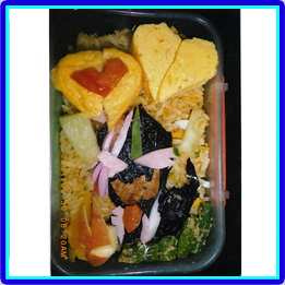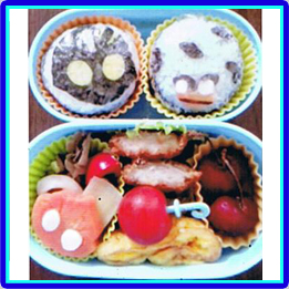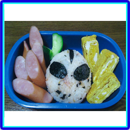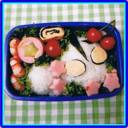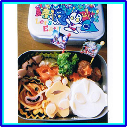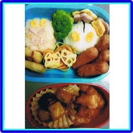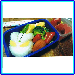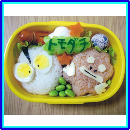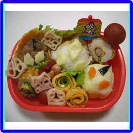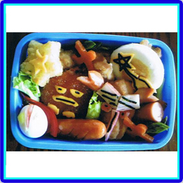 不器用ながらも娘に教わり孫のために作ったお弁当。キャラクターの名前も分からないのに頑張りました。孫もにっこり。 |