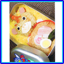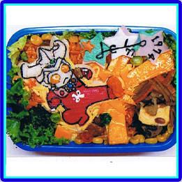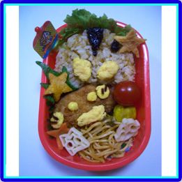 たくさん食材を使い、中身も見た目もにぎやかに仕上げました。見えない所まで、マッシュポテトや玉子焼き、ハンバーグなどかくれんぼしています。 |