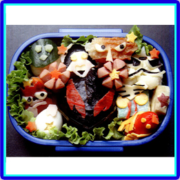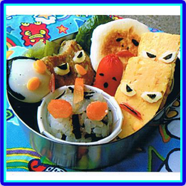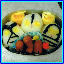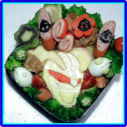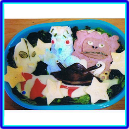 子供の大好きなウルトラマンとバルタン星人をメインにし、トマトのノーバやミートボールのピグモン(手と顔が大変でした)ハムチーズのカネゴンが仲良くウィンナー玉子の花畑で記念写真です。 |