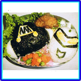 オムライスを作っていてピンときたので作ってみました。赤ピーマンがそれらしくて良かったのですが、上手く加工するのが難しかったです。ミラーナイフのスライスチーズ、薄くそいだしば漬け、頑張って切ったけど湿気でまるまった海苔が残念。 |