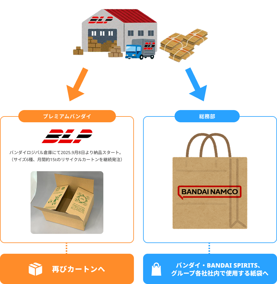 今回の取組みは、バンダイロジパルの拠点で排出された使用済み段ボールをリサイクルし、梱包用段ボールとして再利用します。