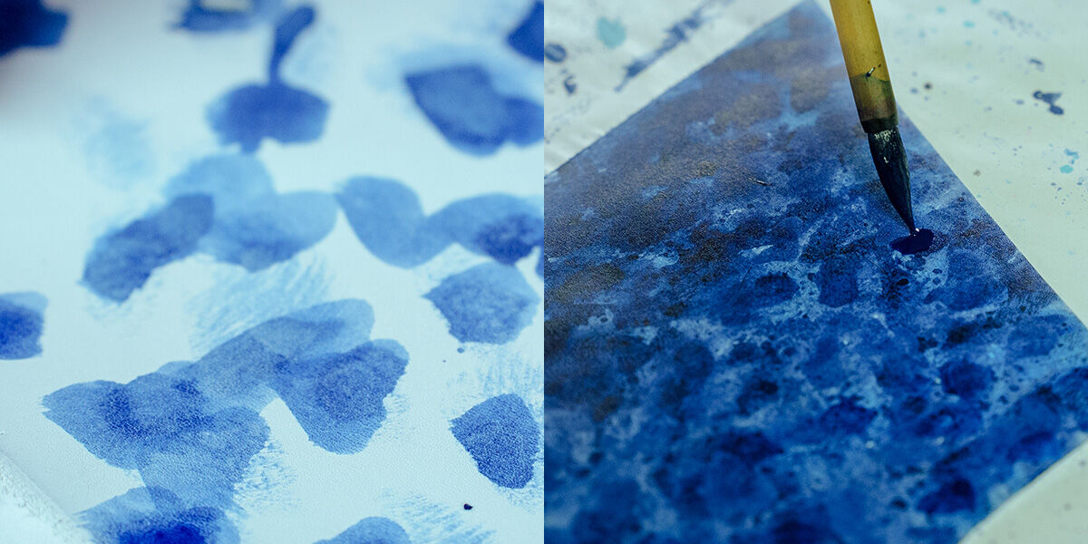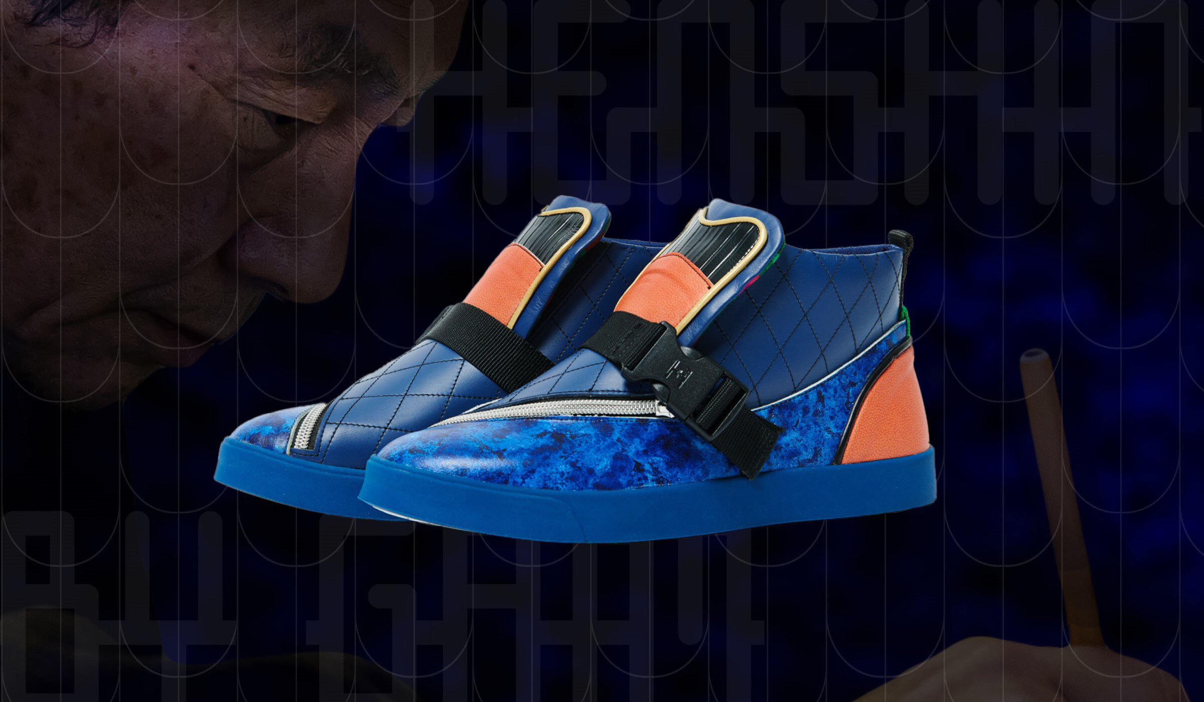 まず、大植氏の持つ技術をレザー着色に落とし込む作業からスタート。テスト塗装を何十回と繰り返しながら、藍色の深さを追求した。ようやくたどり着いたのは「少しの顔料を、都度、緩やかに乾燥させ、色を重ねていく方法」だ。つまり、このスニーカーの神々しい藍色は、目が眩むほどの工程を経ている。大植氏は「“ほんまもん”と“変身”に向き合っている時間は、苦労もあったが楽しかった。」とのこと。このスニーカーには、「真の藍色」に、プラスワン京都の伝統工芸の底力「変身する力」が装備されているということだ。