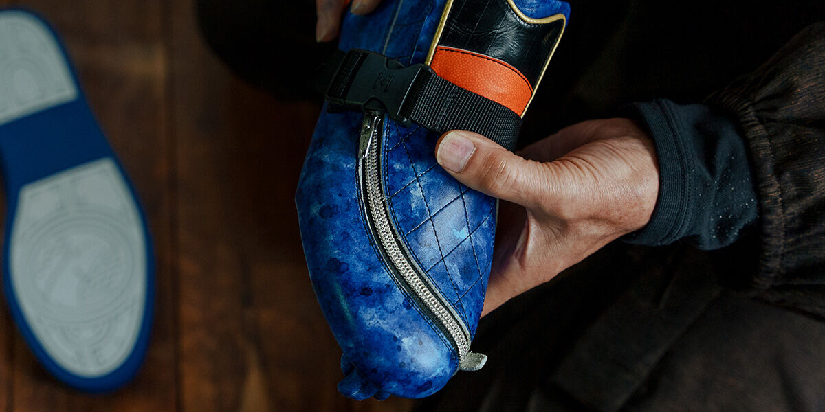 今回、この造形美に命を吹き込み、スニーカーを履く者をもっと強く、かっこよく変身させるためのこだわりが「レザーの色」だ。基調はガイムのメインカラーである深い藍色だが、レザーには絶妙な濃淡が表現され、優しいながらも強さを感じさせる風合いがある。このレザーの染色は京都西陣の染め職人・大植裕氏によって実現された。