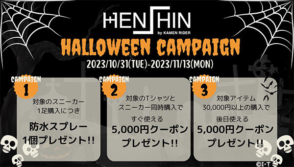 B対象のスニーカーとTシャツを合計3万円以上購入で、後日HENSHIN by KAMEN RIDER『ハロウィンクーポン対象商品』で使える5,000円クーポンをプレゼント!