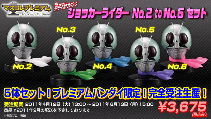 プレミアムバンダイ限定!完全受注生産!! △△△△△△△△△△△△△△△△△△△△△△△△△△△△ 「ハイパーホビー」誌(2011年6月1日発売7月号、54ページ)にて、本商品の受注期間の記載に誤りがありました。 本商品の受注期間は2011年6月13日(月)15:00までとなります。お気をつけください。 【悪のライダー『ショッカーライダー』がマスコレプレミアムに登場!】 悪の組織「ゲルショッカー」によって生み出された「ショッカーライダー」! No.1〜No.6の6体が存在すると言われ、 その能力は仮面ライダー新1号・2号と同等!? 幾度となくダブルライダーを苦しめた、シリーズ創成期の重要なヒール(悪役)でもある。 ショッカーライダー達は、それぞれマフラーの色が異なり、 この限定品でも、その点はしっかりと再現されている。 ・ショッカーライダーNo.2 (マフラーは白色) ・ショッカーライダーNo.3 (マフラーは緑色) ・ショッカーライダーNo.4 (マフラーは青色) ・ショッカーライダーNo.5 (マフラーは紫色) ・ショッカーライダーNo.6 (マフラーは桃色) 以上、5体のマスクに台座5点(点灯はいたしません)が付属のセットで登場。 プレミアムバンダイ限定・完全受注生産となるため、是非、この機会をお見逃しなく! 受注期間は 2011年4月12日(火)13:00 〜 2011年6月13日(月)15:00、(※1) 商品は、2011年9月の発送を予定。(※2) そして… 気になるショッカーライダーNo.1(マフラーは黄色)は、 仮面ライダー ライダーマスクコレクション Vol.7の「シークレット」として、既に登場している。 プレミアムバンダイでもBOXセットで販売中なので、是非ショッカーライダーをコンプリートしてもらいたい! ※ショッカーライダーNo.1は、ご購入いただいたBOXセットに必ずしも含まれるとは限りません。 ※在庫切れの際には、ご容赦ください。 【対象年齢】 15才以上 【商品サイズ】 5点共に、台座飾りつけ時全高(台座底面より触覚含め)約75mm、 台座底面、直径約53mm。 ※いずれも開発中の数値であり、実際の商品とは多少異なることがございます。ご了承ください。 【セット内容】 ・マスク5点 ・台座5点(台座は点灯しません) ※マスコレ(マスクコレクション)シリーズとは… 仮面ライダーシリーズ、ウルトラマンシリーズをはじめとし、 特撮やアニメ番組のヒーロー達の「頭部」モデル、すなわち「マスク」を、 卓上のコレクションに適したサイズで精巧に再現したシリーズです。 マスクは台座にかざりつけることができ、台座は直径約53mmの大きさです。 (詳しくは「マスコレ公式サイト」をご覧ください!) ※1 受注期間の日時は弊社システムのカレンダー・時計によって判断し、実際の日時とは多少異なる場合がございます。 予定数を大幅に上回った場合、予定期間内であってもご注文の受付を一時休止し、 後日、二次受注として再開させて頂く場合がございます。二次受注分の出荷時期は、受注再開時にご案内いたします。 ※2 2011年9月中の出荷に努めさせていただきますが、 ご注文状況によっては、発送時期が多少前後する場合もございますので、ご了承ください。 ※本ページに掲載された商品写真・仕様は、開発中のものです。 |