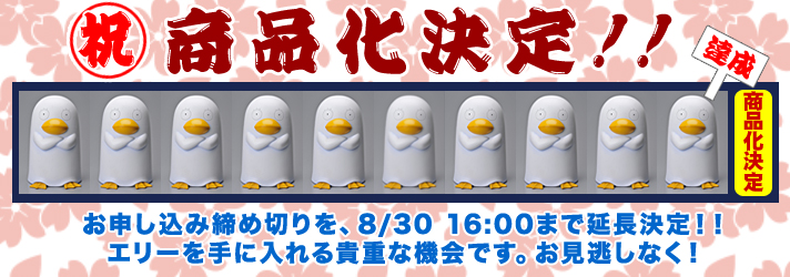 エリザベス、堂々の立体化?!桂もすっぽり入る大ボリューム感。全長約260mm!! ただし、リクエスト企画!商品化希望のリクエストが3,000個に達成したら商品化! 達成しなければ空知先生だけにあげちゃうぞ?! お届けはお届けは12月予定!メリークリスマス?! お届け時にはクリスマスカードも添えさせて頂きます。桂と一緒にエリザベスも飾ってください! 8/23追記 皆様のご声援をうけまして、商品化決定致しました! ご好評につき、ご注文の受付を8/23(火)⇒8/30(火)16:00まで延長致します。 ■本商品は、リクエスト企画商品です。■ リクエスト受付期間:7月4日(月)13:00〜8月23日(火)16:00予定 (※8/23追記:8/30(火)16:00まで御注文受付いたします。) 本商品は、期間内にお申し込み数が3000個に達した場合、商品化となります。 期間内にお申し込み数が3000個に達しなかった場合、商品化見送りとなります。 商品化決定の際には、本ページにて告知させていただきます。 (※8/23追記:商品化決定致しました) ※商品化に到らなかった場合に関して 商品化が実現しなかった場合、お客様のご注文履歴は取り消させていただきます。 またお申し込みいただいたお客様には、メールにてお知らせ致します。 (※8/23追記:商品化決定致しました) ※受付期間に関して 生産可能な数に限りがございますので、早期にお申し込みを終了させていただく場合がございます。 ※キャンセルに関して リクエスト企画商品はアンケートではございません。ご注文が完了した時点で「ご購入希望」とお受けし、 注文数量達成による商品化決定段階でのキャンセルは、お断りさせていただきますのでご了承下さい。 お申し込み制限:お1人様1回まで / 商品はお1人様3個までお申し込みいただけます。 ※お申し込み完了後、購入数をご変更いただくことはできません。 お支払方法:お申し込み時点では、代金引換のみのお取扱となります。 クレジットカードへのお支払い方法変更は、商品化実現後、 マイページにてお客様ご自身でおこなっていただくことが可能です。 (※8/23追記:商品化決定致しました。クレジットカードへのお支払い方法変更は、御注文受付締め切り後、マイページにてお客様ご自身で行なっていただくことが可能です。ご注文のお客様には、別途メールにてご案内させていただきます。) |