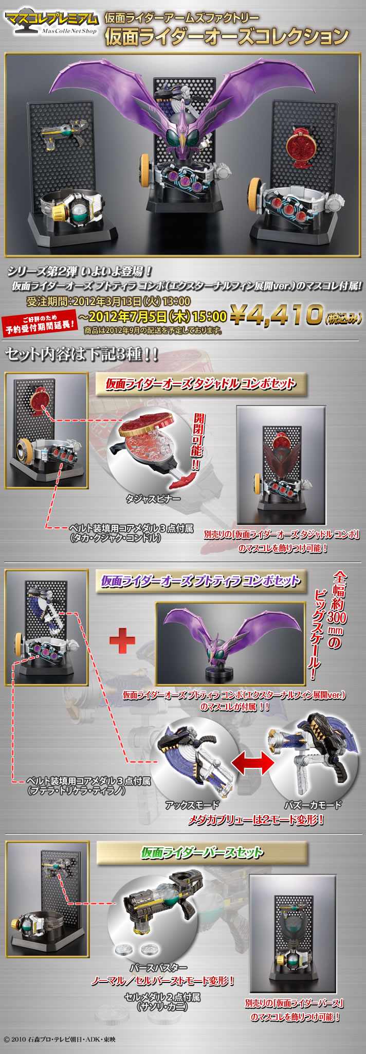 ご好評のため、予約受付期間延長決定! ※商品の配送予定に、変更はございません。 「仮面ライダーアームズファクトリー」待望の第2弾! 「仮面ライダーオーズコレクション」登場! △△△△△△△△△△△△△△△△△△△△△△△△△△△△ 【仮面ライダーオーズ プトティラ コンボ(エクスターナルフィン展開Ver.)付属!】 仮面ライダーの変身ベルトや装備品の数々を、マスコレシリーズで培われた造形によって再現! マスコレと共にディスプレイ可能な「アームズファクトリー」シリーズに、 第2弾「仮面ライダーオーズコレクション」がついに登場! 注目のセット内容は下記の通り! ◆仮面ライダーオーズ タジャドル コンボセット ・オーズドライバー タカ・クジャク・コンドルの装填用コアメダル3枚が付属。 ・タジャスピナー 新規造形!小型ながらも開閉可能! ・台座/背面パネル/飾り用ピン 一式 ・仮面ライダー ライダーマスクコレクション Vol.11(別売り)にラインナップの、 仮面ライダーオーズ タジャドル コンボを飾り付けるとイメージさらにアップ! ◆仮面ライダーオーズ プトティラ コンボセット ・マスコレ 仮面ライダーオーズ プトティラ コンボ(エクスターナルフィン展開ver.) 新規造形!全幅約300mm(※)のビッグサイズ!マスコレ用台座(発光台座ではありません)付き。 ・オーズドライバー プテラ・トリケラ・ティラノの装填用コアメダル3枚が付属。 ・メダガブリュー 新規造形!アックスモード/バズーカモードの2モードに変形可能! ・台座/背面パネル/飾り用ピン 一式 ◆仮面ライダーバースセット ・バースドライバー 新規造形!サソリ・カニの装填用セルメダル2枚が付属。 ・バースバスター 新規造形!ノーマルモード/セルバーストモードの2モードに変形可能! ・台座/背面パネル/飾り用ピン 一式 ・仮面ライダー ライダーマスクコレクション Vol.11(別売り)にラインナップの、 仮面ライダーバースを飾り付けるとイメージさらにアップ! 以上の3セットを、まとめてお届け! プレミアムバンダイ限定、受注生産方式(ご予約いただいた数量のみの生産)となります。 確実なご入手には、お早目のご予約をお願い致します! 受注期間は、2012年3月13日(火)13:00 〜 2012年7月5日(木)15:00、(※1) 商品は、2012年9月の発送を予定。(※2) 【対象年齢】 15才以上 【商品サイズ】 3点ともに、台座底面より背面パネル上辺まで、約128mm。 仮面ライダーオーズ プトティラ コンボ(エクスターナルフィン展開ver.)は、全幅約300mm。 ※いずれも開発中の数値であり、実際の商品とは多少異なることがございます。ご了承ください。 ※マスコレ(マスクコレクション)シリーズとは… 仮面ライダーシリーズ、ウルトラマンシリーズをはじめとし、 特撮やアニメ番組のヒーロー達の「頭部」モデル、すなわち「マスク」を、 卓上のコレクションに適したサイズで精巧に再現したシリーズです。 マスクは台座にかざりつけることができ、台座は直径約53mmの大きさです。 (詳しくは「マスコレ公式サイト」をご覧ください!) ※1 受注期間の日時は弊社システムのカレンダー・時計によって判断し、実際の日時とは多少異なる場合がございます。 予定数を大幅に上回った場合、予定期間内であってもご注文の受付を一時休止し、 後日、二次受注として再開させて頂く場合がございます。二次受注分の出荷時期は、受注再開時にご案内いたします。 ※2 2012年9月中の出荷に努めさせていただきますが、 ご注文状況によっては、発送時期が多少前後する場合もございますので、ご了承ください。 ※本商品は日本国外で販売する可能性がございます。ご了承ください。 ※本ページに掲載された商品写真・仕様は、開発中のものです。 ※ [2012/3/15 追記] 一部、「全幅800mm」との記載がありましたが、「全幅300mm」の誤りです。謹んで修正させていただきます。 |