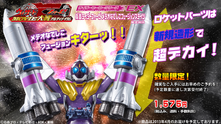 「仮面ライダーフォーゼ メテオなでしこフュージョンステイツ」が、 プレミアムバンダイ限定のソフビ人形で初登場! △△△△△△△△△△△△△△△△△△△△△△△△△△△△ 【両腕のロケットモジュールは完全新規造形!約125mmのビッグサイズ!】 劇場版『仮面ライダー×仮面ライダー ウィザード×フォーゼ MOVIE大戦アルティメイタム』に登場する、 「仮面ライダーフォーゼ メテオなでしこフュージョンステイツ」のソフビ人形が、 プレミアムバンダイ限定で登場! 「仮面ライダーフォーゼ」がフュージョンスイッチで、 「仮面ライダーメテオ」と「仮面ライダーなでしこ」のパワーを取り込み、ステイツチェンジした状態、 「仮面ライダーフォーゼ メテオなでしこフュージョンステイツ」! 両腕のロケットモジュールは完全新規造形!約125mmのビッグサイズ! 「仮面ライダーなでしこ」のシルバー、ブルー、ピンクで彩色! ロケットモジュールを含めた全幅は、約136mmと、通常のソフビ人形の約2体分! ベルトをはじめ、さまざまな部位を緻密な彩色で再現! 「仮面ライダーフォーゼ メテオフュージョンステイツ」からレベルアップした 「仮面ライダーフォーゼ メテオなでしこフュージョンステイツ」は、 顔の色が異なり、ダークパープルクリアで再現! プレミアムバンダイ限定、5,000個の数量限定生産となります! 確実なご入手には、お早目のご予約をお願い致します! ※本商品は、「ライダーヒーローシリーズEX 仮面ライダーフォーゼ メテオフュージョンステイツ」の金型を一部流用しています。 受注受付は、2012年12月7日(金)11:00 より!(※1) なお、本商品は数量限定(※2)のため予定数量に達し次第、受注終了となります。 商品は、2013年4月の発送を予定。(※3) 【対象年齢】3才以上 【製品素材】PVC ※1 受注期間の日時は弊社システムのカレンダー・時計によって判断し、実際の日時とは多少異なる場合がございます。 ※2 本商品は数量限定での販売となります。予定数量に達し次第、ご注文の受付を終了いたします。 予定数を大きく上回るペースでのご注文をいただいた場合、お届け時期を変更し、再度受注を行う場合がございます。 ※3 2013年4月中の出荷に努めさせていただきますが、 ご注文状況によっては、発送時期が多少前後する場合もございますので、ご了承ください。 ※本商品は日本国外で販売する可能性がございます。ご了承ください。 ※本商品は、弊社主催イベントや他の企画等で販売をさせていただく場合がございます。 ※本ページに掲載された商品写真・仕様は、開発中のものです。 商品仕様等は予告なく変更になる場合があります。 |
