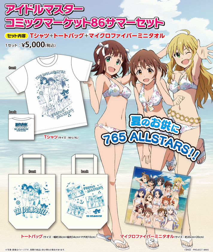 水着の765PROメンバーによるTシャツ、トートバッグ、マイクロファイバーミニタオルのセットです。