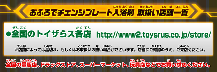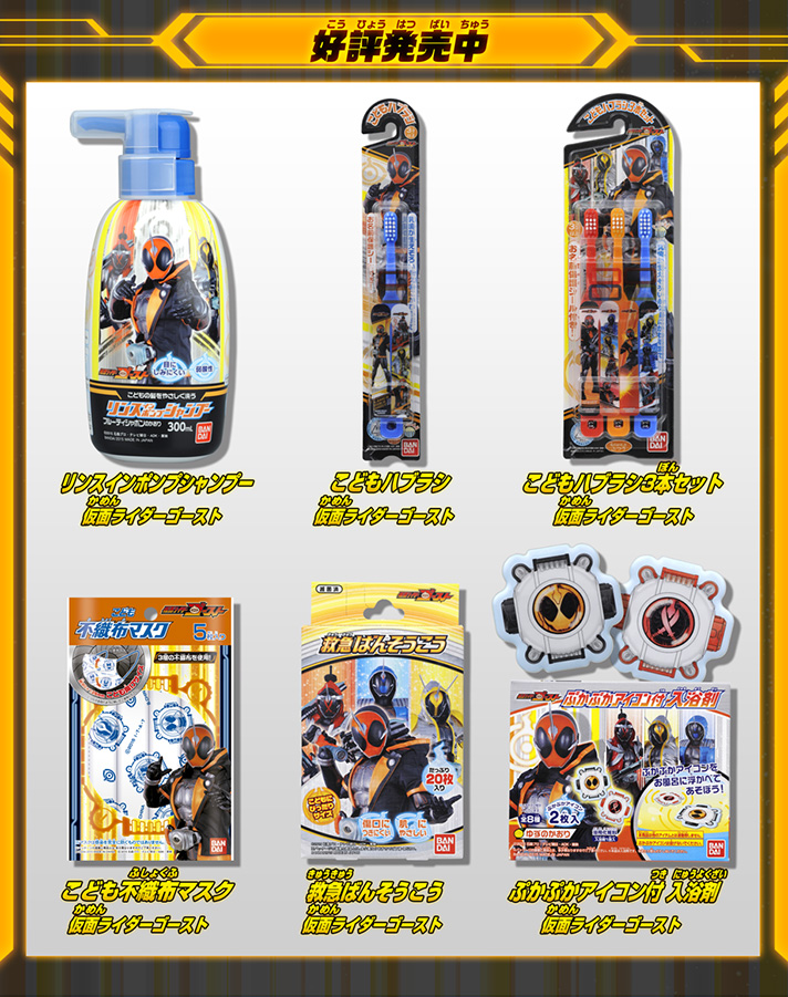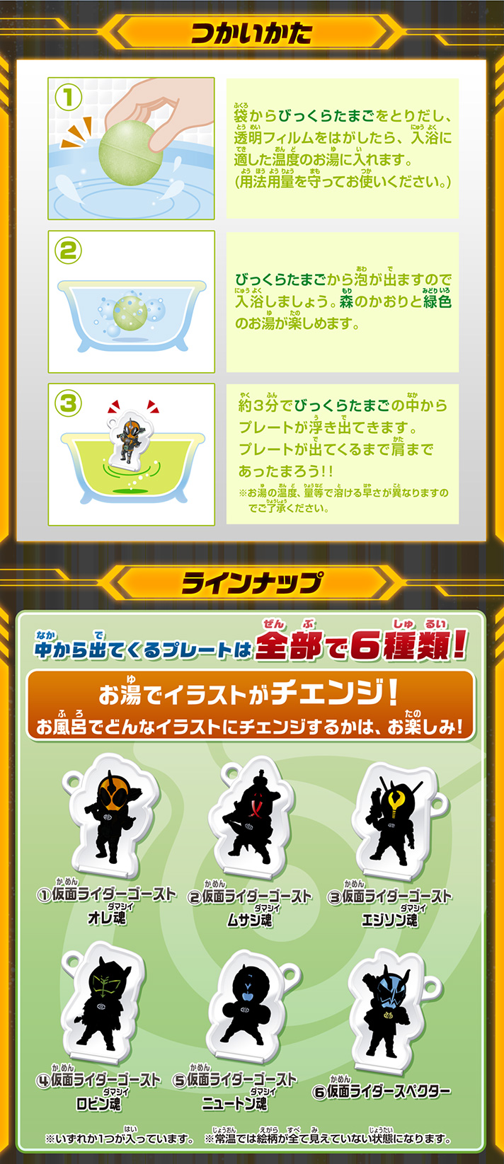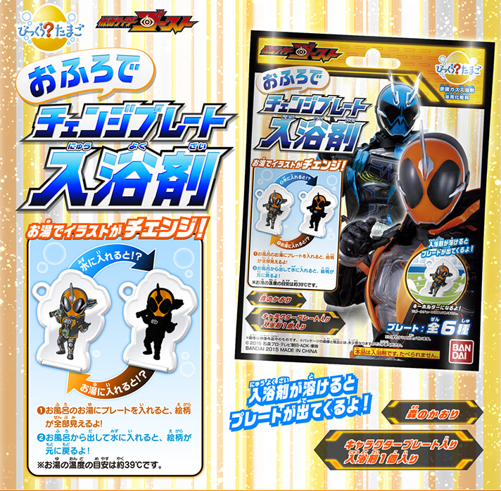 プレートマスコット入り球形入浴剤1個 ●入浴剤(浴用化粧料) 香り:森の香り 色:緑色 容量:75g ●チェンジプレートマスコット 「仮面ライダーゴースト」デザインのチェンジプレートの種類は全部で6種類! 種類:(1)仮面ライダーゴースト オレ魂、(2)仮面ライダーゴースト ムサシ魂、(3)仮面ライダーゴースト エジソン魂、(4)仮面ライダーゴースト ロビン魂、(5)仮面ライダーゴースト ニュートン魂、(6)仮面ライダースペクター ※いずれかひとつが出てきます。 ※マスコットの種類は選べません。 ●発売日 2015年11月25日(水)10時より、プレミアムバンダイにて販売開始 2015年11月下旬より、順次店頭販売開始 JANコード:4549660-02616-7新番組「仮面ライダーゴースト」のびっくらたまごに、マスコットプレートのイラストが変わる「おふろでチェンジプレート入浴剤」が新登場! お風呂のお湯に入れると温度でプレートのイラストが変わり、「仮面ライダーゴースト」に登場するキャラクターが登場します。※お湯の温度の目安は39℃です。 森のかおりの入浴剤が溶けると、中からチェンジプレートが1つ出てきます。 マスコットの種類は集めて楽しい全6種類! 入浴剤のかたちは球型で、緑色のお湯です。 |