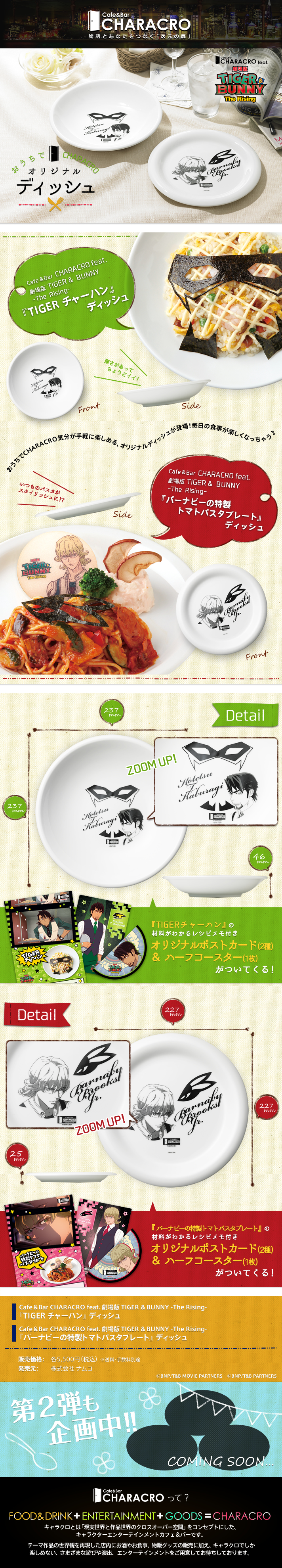 株式会社ナムコが運営するキャラクターエンターテインメント飲食施設「Cafe&Bar CHARACRO feat. 劇場版 TIGER & BUNNY -The Rising-」(以下「キャラクロ」)にてご好評を頂いている、「TIGER & BUNNY」の世界観をコンセプトとしたメニューや、店舗の楽しい空間をご自宅で再体験できる「おうちでCHARACRO」をコンセプトとしたアイテムとなっています。