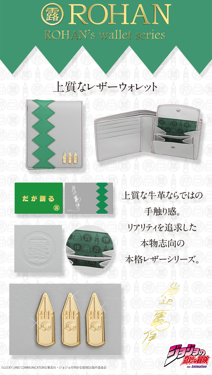 上質で滑らかな牛革を使用した岸辺露伴のレザーウォレット(二つ折りタイプ)が登場! 使用を繰り返すことで、艶感が増し、味わい深さも楽しめます。 岸辺露伴のレザーウォレット(二つ折りタイプ)はグレーの牛革をベースに、 トレードマークであるヘアバンドをグリーンでデザイン。 ゴールドのGペンアチャームが3つ付属し、 紫のステッチがアクセントになったこだわりのレザーウォレットです。 岸辺露伴の名台詞『だが断る』カードが付属しています。。 人気の二つ折りのタイプは、小銭入れもセパレイトタイプでこだわりの仕様です。 【全1種】グレー×グリーン 【セット内容】レザーウォレット(二つ折り)本体 岸辺露伴『だが断る』カード1枚 専用ケース付 【サイズ】本体:95mm×190mm×22mm 岸辺露伴『だが断る』カード:約縦54mm×横86mm ※収納カード枚数:4枚 【素材】 表:牛革 裏:合皮 生地部分:ポリエステル Gペン部分:真鍮 カード:PET ★★★素材に関する注意事項★★★ ※ご購入前に必ずお読みいただきご了承のうえご購入ください。 ■本製品は、牛革を使用しています。 天然の革ならではの天然シボ(シワ模様)が特徴です。 生地はとても柔らかく、使用していく中で艶感が増していくのが本製品の魅力でもあります。 ■天然素材のため、色むらや、小傷には個体差がございます。 あらかじめご理解ご了承の上、お買い求めください。 ■本製品は、汗や水、摩擦等により多少の色落ち 色移りする場合があります。 ベンジン類のご使用は避けて 濡れた時は、柔らかい布で押さえるように水分を取ってから陰干しで乾かして下さい。 ドライヤー等で乾かしたり、直射日光に当てて乾燥させたりはしないでください。 【生産国】中国 【対象年齢】 15才以上 ※写真は開発中のものです。デザイン・仕様は変更になる場合がございますので予めご了承下さいませ。 ※ご注文後のキャンセルは、一切お受けできません。 ※生産上の都合により、お届け日が変更となることがございます。予めご了承下さい。 ※準備数に達した場合、早期に予約を終了させていただくことがございます。 |