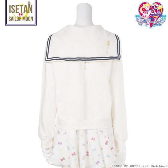 セーラームーンの変身アイテムである、「レインボームーンカリス」をポケット部分に、セーラー衿の外側部分にはスパイラルハートムーンロッドの刺繍を施しており、衿を閉じてフードにするとコズミックハートコンパクトの刺繍が現れます。