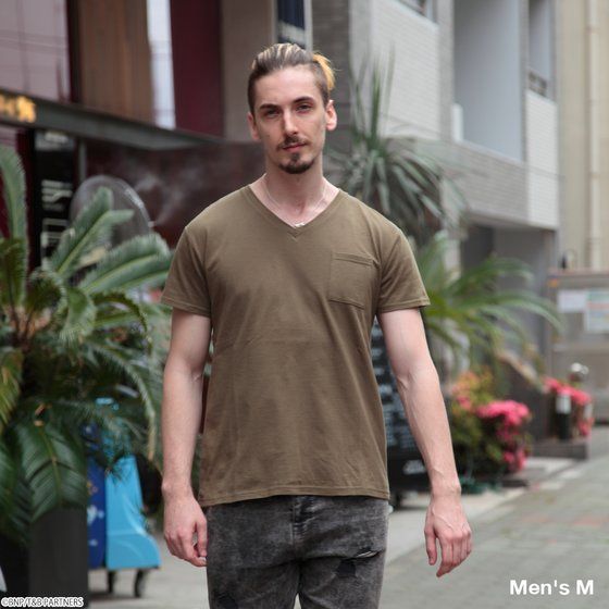 TIGER & BUNNY シュテルンビルト 女神像バックプリント VネックTシャツ / カーキ / メンズM