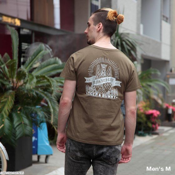 • TIGER & BUNNY シュテルンビルト 女神像バックプリント VネックTシャツ / カーキ / メンズM