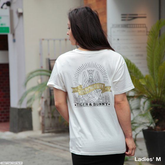 • TIGER & BUNNY シュテルンビルト 女神像バックプリント VネックTシャツ / ホワイト / レディースM