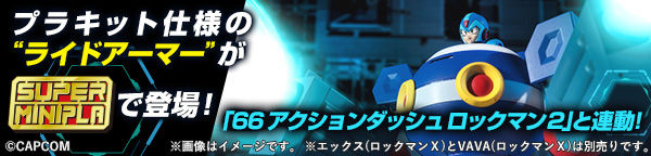 「66アクションダッシュ ロックマン」シリーズの第2弾が登場!ラインナップは「エックス」「VAVA」「ロックマン」「カットマン」「スーパーロックマン」の5種類。 エックスには「左手アームパーツ」、VAVAには「グラス」、ロックマンには「ソード」、カットマンには「メットール」、スーパーロックマンには「ロケットバスターエフェクト」が付属。 エックスとVAVAには同時発売予定の「スーパーミニプラ ライドアーマー」に搭乗させる為のグリップ用手首パーツも付属! また、エックスの頭部と肩は新規造形となり、アクション性を向上して展開!