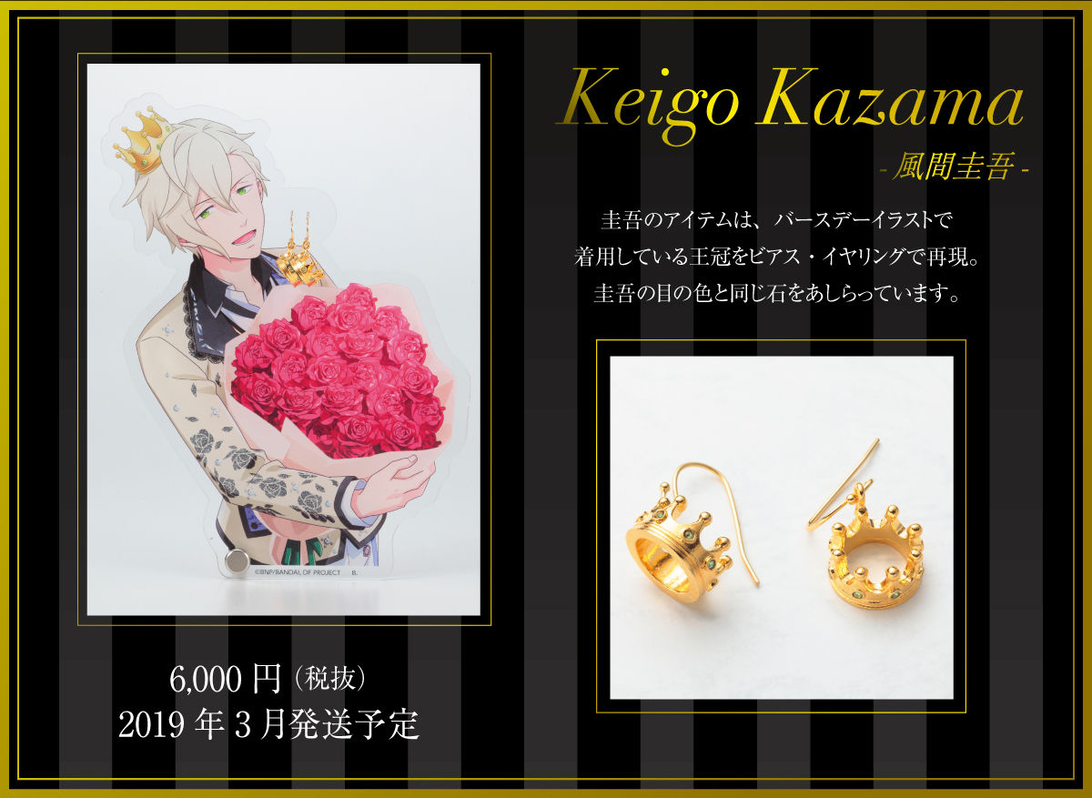 風間圭吾のバースデーアイテムが登場しました。 バースデーイラストで着用している王冠をピアスで再現しました。 イヤリングもご用意しております。 ■内 容:ピアス(イヤリング)、アクセサリースタンド ■素 材:アクリル、鉄、合金、キュービックジルコニア、真鍮 ■原産国:日本 ■対象年齢:15歳以上 ■詳細情報: ・アクセサリースタンド…約縦19.0cm×横13.0cm ・ピアス(イヤリング)…トップ 約直径10.0mm×縦8.0mm×厚み2.0mm ※イヤリングタイプをご購入のお客様には、ピアスホールが開いていない仕様のアクセサリースタンドをお届けします。 ※体質によっては皮膚が赤くなったり、かゆみ・かぶれを生じたりする場合があります。 皮膚に異常を感じたときは直ちに使用を中止して、皮膚科専門医にご相談ください。 ※お届け時期を変更し、ご注文を承る場合がございます。 ※準備数に達した場合、早期に販売を終了させていただくことがございます。 ※商品仕様等は予告なく変更になる場合があります。 ※掲載している写真は開発中のため、実際の商品とは多少異なる場合があります。 |