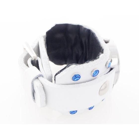 ホワイトレザーの両サイドにブルーのラインストーンを配置したセクシーでクールなベルトです。
