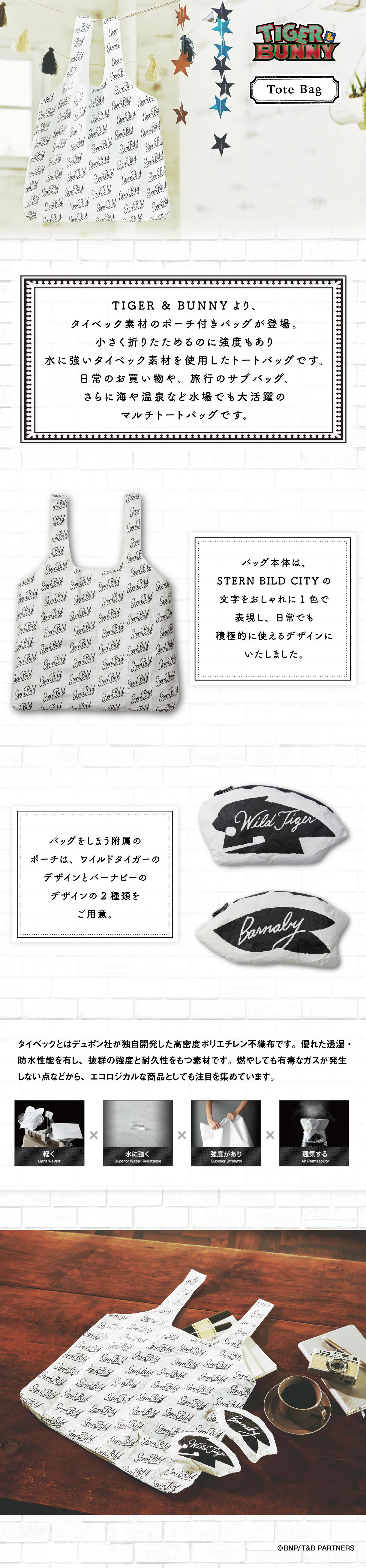 小さく折りたためるのに強度もあり水に強いタイベック素材を使用しトートバッグです。 コンパクトかつ水に強いので、日常のお買い物のエコバッグとしても、旅行のサブバックとしても、海や温泉など水場でも大活躍です。 バッグ本体は、STERN BILD CITYの文字をおしゃれに1色で表現し、日常でも積極的に使えるデザインにいたしました。 バッグをしまう附属のポーチは、ワイルドタイガーのデザインとバーナビーのデザインの2種類をご用意しております。 ・対象年齢 :15才以上