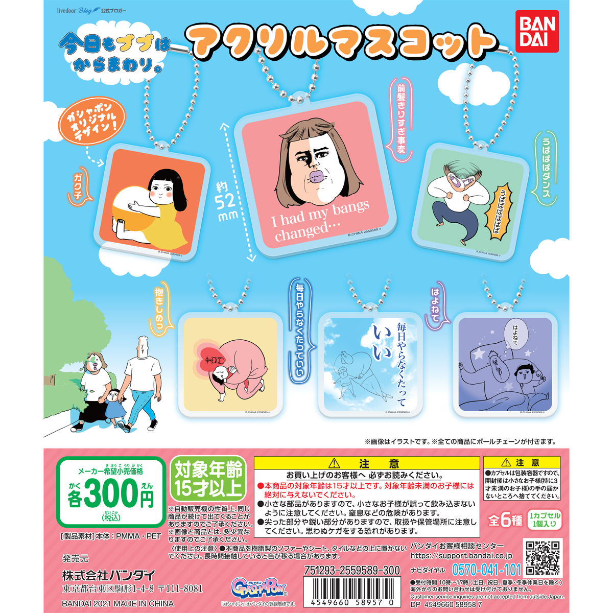 大人気ライブドア公式ブログの“今日もブブはからまわり。”のアクリルプレートがガシャポンに登場! カプセル商品オリジナルの描き起こしイラスト“ガク子”もラインナップ! 【セット内容】 ・アクリルマスコット…全6種 ※全ての商品にボールチェーンが付きます。 【商品素材】 本体:PMMA・PET 【商品サイズ】 約52mm 【対象年齢】 15歳以上 ※商品の仕様に関して※ ・掲載写真は試作品です。実際の商品とは異なる場合がございますのでご了承ください。 ・カプセルが付属します。緩衝材も兼ねておりますので、カプセルの破損については補償いたしかねます。 ※ご注文条件に関して※ ・商品仕様や発送日は予告なく変更になる場合がございます。予めご了承ください。 ・準備数に達し次第、ご注文の受付を終了致します。多数のご要望をいただいた場合、準備数を調整して再度販売することがございます。予めご了承ください。 ・サービスの性質上、同じ商品が続けて出てくることがありますのでご了承ください。 |