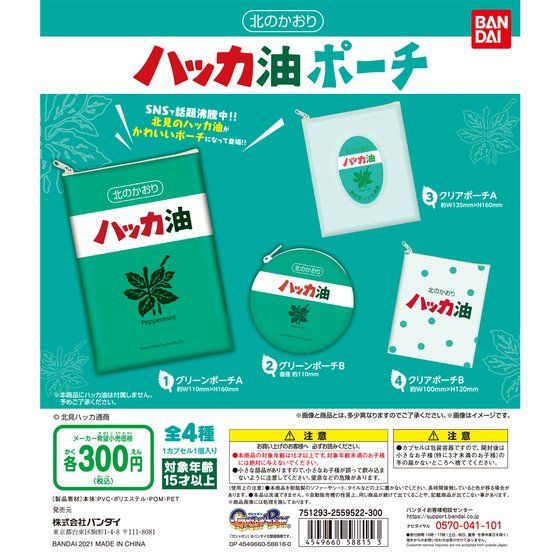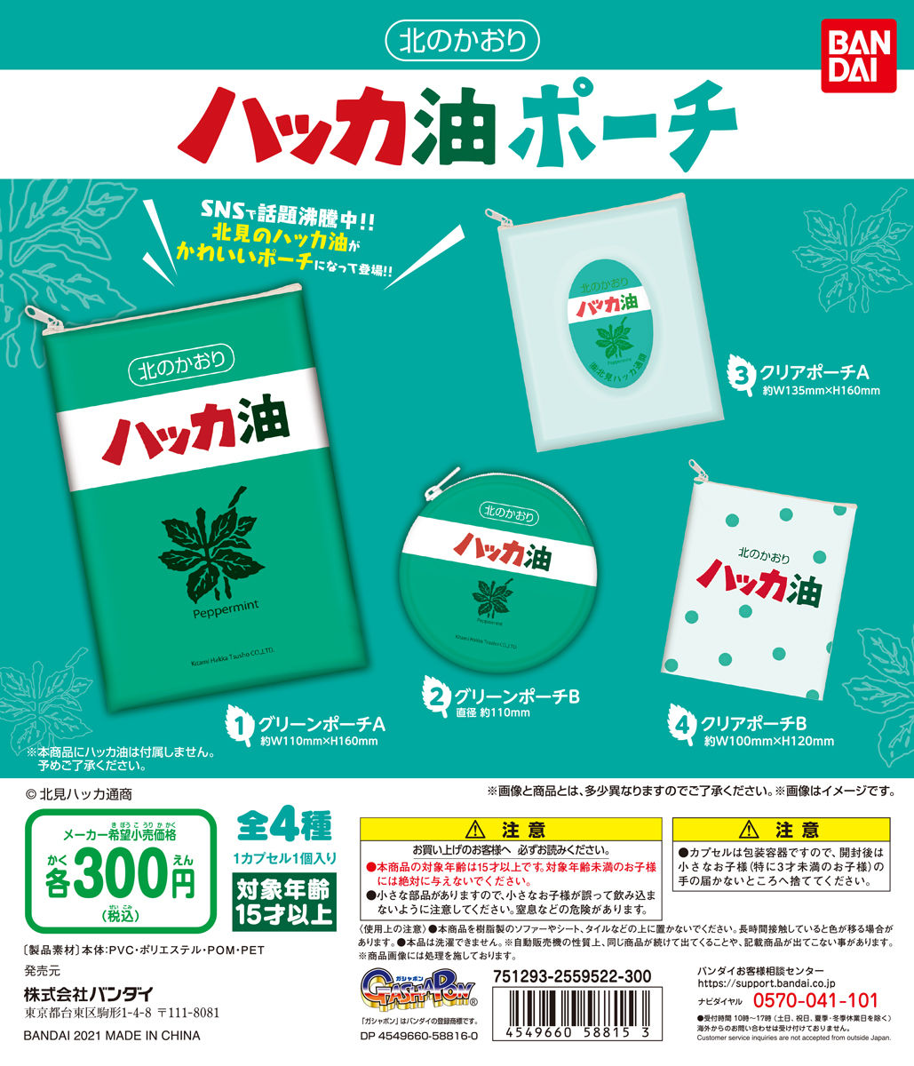 北見のハッカ油が、かわいいポーチになって登場! 【セット内容】 全4種 @グリーンポーチA AグリーンポーチB BクリアポーチA CクリアポーチB 【商品素材】 本体:PVC・ポリエステル・POM・PET 【商品サイズ】 @約W110×H160mm A直径 約110mm B約W135×H160mm C約W100×H120mm 【対象年齢】 15歳以上 ※商品の仕様に関して※ ・掲載写真は試作品です。実際の商品とは異なる場合がございますのでご了承ください。 ・カプセルが付属します。緩衝材も兼ねておりますので、カプセルの破損については補償いたしかねます。 ※ご注文条件に関して※ ・商品仕様や発送日は予告なく変更になる場合がございます。予めご了承ください。 ・準備数に達し次第、ご注文の受付を終了致します。多数のご要望をいただいた場合、準備数を調整して再度販売することがございます。予めご了承ください ・サービスの性質上、同じ商品が続けて出てくることがありますのでご了承ください。 |
