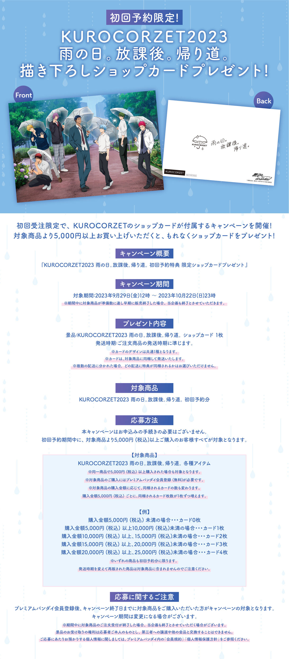 KUROCORZET2023年新作「雨の日。放課後。帰り道。」シリーズが登場! KUROCORZETとは、アニメ『黒子のバスケ』に登場する黒子を始めとしたキャラクターイメージのアパレルブランドです。 彼らが自然体で居られる、着る人の魅力を引き出すためのデイリーウェアをデザインします。 今回のテーマは「雨の日。放課後。帰り道」。 雨が降る放課後。黒子たちの帰り道を描きました。 試合や練習では見ることのできない、彼らのプライベートな表情をお楽しみ頂けます。 黄瀬、赤司がそれぞれ制服の上に着用する、フード付きパーカーは、普段着にもぴったりのシンプルなカラー展開でご用意いたしました。 胸部分のワンポイントには、「雨の日。放課後。帰り道。」オリジナルのロゴに、黄瀬・赤司それぞれのイメージカラーを組み合わせたデザインをあしらいました。 憂鬱な雨の日も、あなたの毎日に寄り添う、おしゃれ&かわいい「KUROCORZET」をお楽しみください。 ■サイズ:※男女兼用 M:着丈67/身幅50/肩幅44/袖丈62cm L:着丈70/身幅53/肩幅47/袖丈63cm XL:着丈73/身幅56/肩幅50/袖丈63cm ■素材:綿100% ■生産エリア:ベトナム ※こちらはパーカーの商品ページです。 ※掲載の商品の色と実際の商品が違って見える場合があります。 ※お届け時期を変更し、ご注文を承る場合がございます。 ※準備数に達した場合、早期に販売を終了させていただくことがございます。 ※商品仕様等は予告なく変更になる場合があります。 ※掲載している写真は開発中のため、実際の商品とは多少異なる場合があります。 |