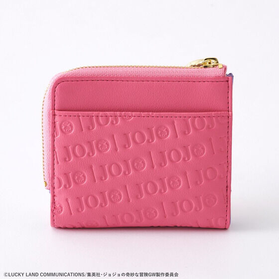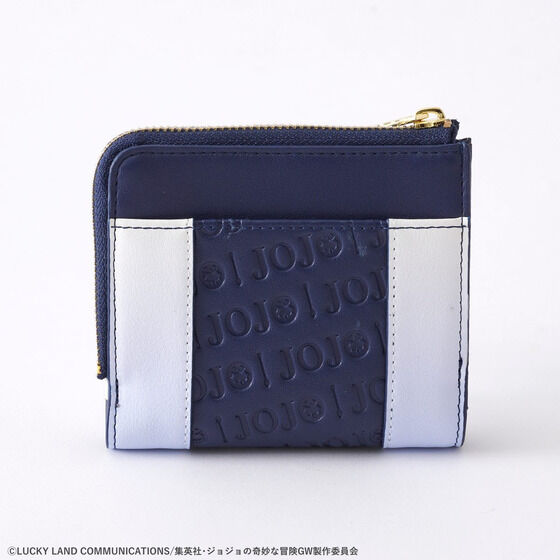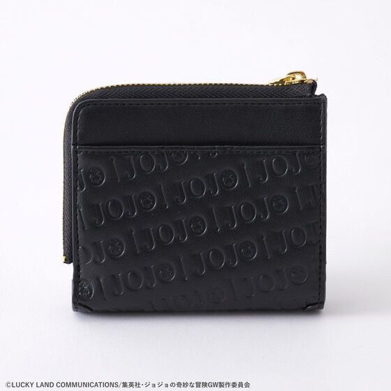 背面はJOJOのロゴが総柄で型押しされており、ファスナー引手部分にはスタンドをイメージしたオリジナルの金具を使用。