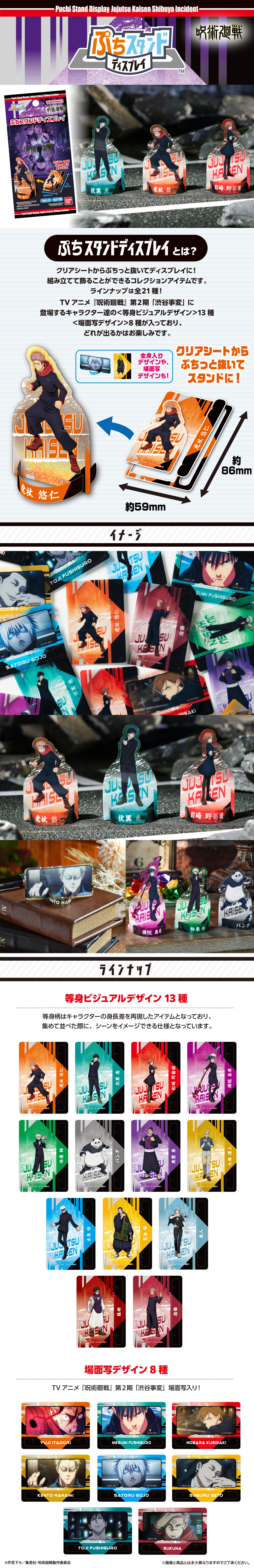 クリアシートからぷちっと抜いてスタンドさせてディスプレイに!組み立てて飾ることもできる新しいコレクションアイテムが登場!ラインナップは全21種。TVアニメに登場するキャラクター達の<等身ビジュアルデザイン>13種と、<場面写デザイン>8種があり、集めて楽しいシリーズです。 いずれか1種が入っており、どれが出るかはお楽しみです。 1BOX 20個入りのBOXセットが登場! ※本商品は全種類揃うコンプリート版ではございません。 【セット内容】 ●ぷちスタンドディスプレイ 呪術廻戦 渋谷事変・・・20枚 【ラインナップ(全21種)詳細】 虎杖 悠仁 伏黒 恵 釘崎 野薔薇 禪院 真希 狗巻 棘 パンダ 東堂 葵 七海 建人 五条 悟 夏油 傑 真人 脹相 宿儺 虎杖 悠仁 場面写デザイン 伏黒 恵 場面写デザイン 釘崎 野薔薇 場面写デザイン 七海 建人 場面写デザイン 五条 悟 場面写デザイン 夏油 傑 場面写デザイン 伏黒甚爾 場面写デザイン 宿儺 場面写デザイン 【素材】 クリアシート:PET・PP 【生産エリア】 日本 【サイズ】 クリアシート:約59mm×86mm ※本商品は全種類揃うコンプリート版ではございません。 ※セット販売のみ承っております。 ※『ぷちスタンドディスプレイ 呪術廻戦 渋谷事変』単品は、一般店舗でも販売いたします。 ※イベントや海外等で販売する可能性がございます。 ※本ページに掲載された商品写真・仕様は開発中のものです。 ※商品仕様等は予告なく変更になる場合があります。 ※お届け時期を変更し、ご注文を承る場合がございます。 |