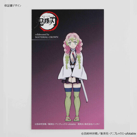 アニメ「鬼滅の刃」 MATERIAL CROWN イメージネックレス第5弾! テレビアニメ「鬼滅の刃」に登場する甘露寺蜜璃、伊黒小芭内をイメージしたネックレス全2種を展開いたします。 商品1点お買い上げごとに、専用アクセサリーケース(紙製/箱)と、 それぞれのキャラクターのイラストが入った専用保証書が1セット付属いたします。 【アニメ「鬼滅の刃」MATERIAL CROWN イメージネックレス 伍 甘露寺蜜璃】 甘露寺蜜璃をイメージしたシルバーネックレス。 恋柱をイメージしたハートモチーフに、日輪刀の鍔の形状を輝石で再現しました。 細部まで「鬼滅の刃」の世界観と愛らしいキャラクターのイメージを凝縮した珠玉のアイテムです。 【アニメ「鬼滅の刃」MATERIAL CROWN イメージリング 伍 伊黒小芭内】 伊黒小芭内をイメージしたシルバーネックレス。 オッドアイをイメージしたイエロー・グリーンの輝石をあしらい、 ヘビの鱗や包帯をモチーフとした造形を施しました。 シンプルながらも、細部まで「鬼滅の刃」の世界観を凝縮した珠玉の造形のアイテムです。 【サイズ】 ■甘露寺蜜璃 イメージネックレス ペンダントトップサイズ:縦約10mm 横約8mm ■伊黒小芭内 イメージネックレス ペンダントトップサイズ:縦約22mm 横約4.7mm ■共通項目 ・Sサイズ 全長45cm(チェーン40cm+アジャスター5cm) ・Mサイズ 全長50cm(チェーン45cm+アジャスター5cm) 【素材】 ■甘露寺蜜璃 イメージネックレス シルバー925(ピンクゴールドコーティング)、合成石ピンクルビー、キュービックジルコニア(ライトグリーン) ■伊黒小芭内 イメージネックレス シルバー925(燻し鏡面仕上げ)、キュービックジルコニア(グリーン、キャナリー) 【共通項目】 ・生産エリア:日本 ・対象年齢:15才以上 ※商品1点お買い上げごとに、専用保証書、専用アクセサリーケース(紙製/箱)が付きます。 ※ジュエリーは大変繊細に作られておりますので、落下や衝撃には十分ご注意くださいませ。 ※商品は撮影状況や、お客様のパソコン・モニター環境などにより実物の色味と若干違って見える場合もございます。予めご了承くださいませ。 ※画像は試作品のため、実際の商品とは多少異なる場合があります。 ※お届け時期を変更し、ご注文を承る場合がございます。 ※準備数に達した場合、早期に販売を終了させていただくことがございます。 ※商品仕様等は予告なく変更になる場合があります。 ※こちらは「アニメ「鬼滅の刃」MATERIALCROWNイメージネックレス 伍 」の販売ページです。販売商品以外は付属しません。 |