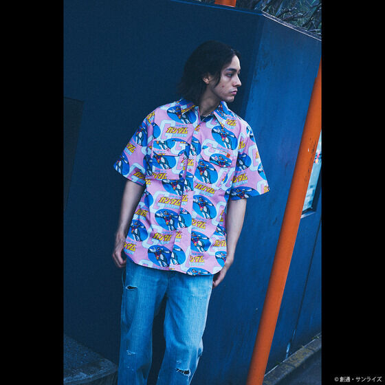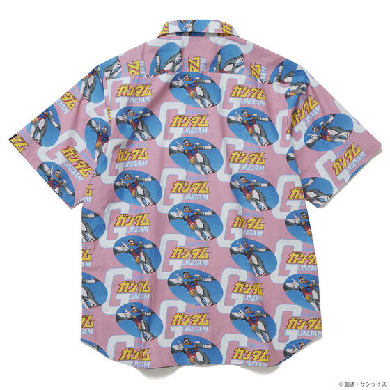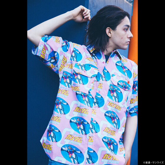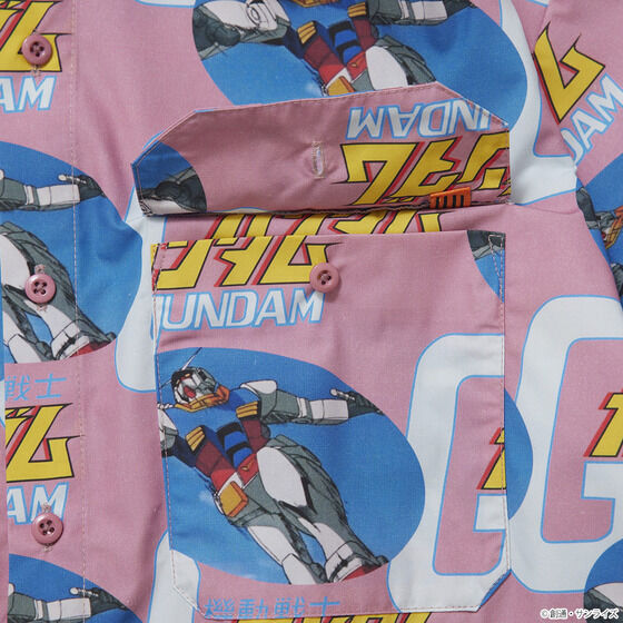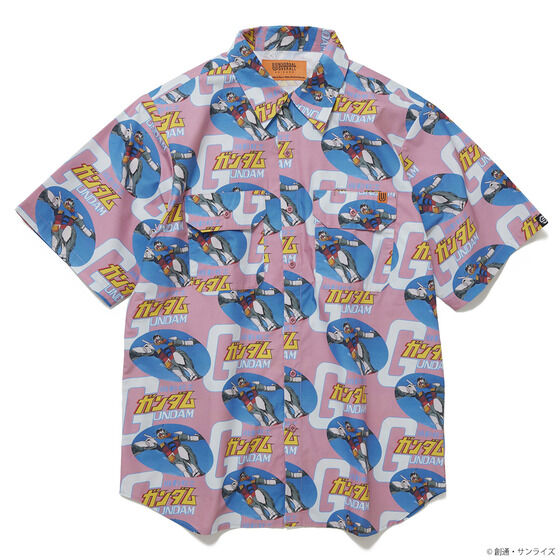 タイトルロゴにガンダムを組み合わせたPOPな総柄デザインが大胆に生地プリントされたシャツは、様々なシーンでお楽しみいただくことができます。