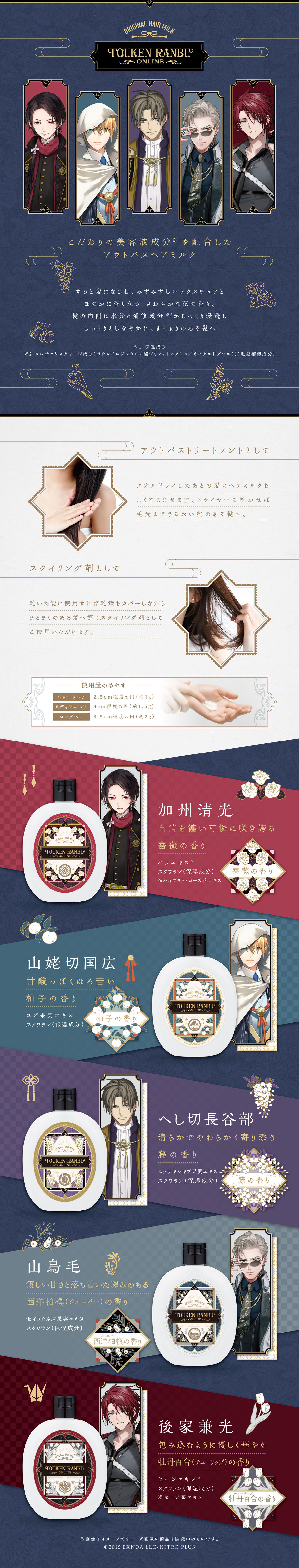 「刀剣乱舞ONLINE」より、ヘアトリートメントミルク第二弾が登場。 加州清光・山姥切国広・へし切長谷部・山鳥毛・後家兼光の5振りをそれぞれイメージしたアウトバスヘアミルクです。 本体ボトルデザインは、各刀剣男士の装いをモチーフとして取り入れたデザインで、洗面所やドレッサーに置いても違和感のない仕様に仕上げています。 ヘアミルクは、すっと髪になじむ、みずみずしいテクスチュアで、こだわりの美容液成分を配合。 香りは各刀剣男士をイメージした5種類で、ほのかに香り立つさわやかな花の香りに包まれます。水分と毛髪補修成分が髪の内側にじっくり浸透し、しっとりとしなやかでまとまりのある髪へ導きます。タオルドライしたあとの髪に使用すれば、うるおい補給のアウトバストリートメントとして。乾いた髪に使用すれば、乾燥をカバーしながらまとまりのある髪へ導くスタイリング剤として、それぞれご使用いただけます。 <ラインナップ/美容液成分> ・加州清光:薔薇の香り(ばらのかおり) コルテックスチャージ成分※1(毛髪補修成分)、スクワラン、バラエキス※2(保湿成分)配合 ・山姥切国広:柚子の香り(ゆずのかおり) コルテックスチャージ成分※1(毛髪補修成分)、スクワラン、ユズ果実エキス(保湿成分)配合 ・へし切長谷部:藤の香り(ふじのかおり) コルテックスチャージ成分※1(毛髪補修成分)、スクワラン、ムラサキシキブ果実エキス(保湿成分)配合 ・山鳥毛:西洋柏槇の香り(ジュニパーのかおり) コルテックスチャージ成分※1(毛髪補修成分)、スクワラン、セイヨウネズ果実エキス(保湿成分)配合 ・後家兼光:牡丹百合の香り(チューリップのかおり) コルテックスチャージ成分※1(毛髪補修成分)、スクワラン、セージエキス※3(保湿成分)配合 ※1 ラウロイルグルタミン酸ジ(フィトステリル/オクチルドデシル) ※2 ハイブリッドローズ花エキス ※3 セージ葉エキス 【セット内容】 洗い流さないヘアトリートメントミルク 1本(100ml) 【サイズ】 約W77×H110.5×D25mm 【製品素材】 ボトル…PET、キャップ…PP 【対象年齢】 15歳以上 【生産エリア】 日本 ※準備数に達した場合、販売を終了させていただくことがあります。 ※ページにアクセスした時点で販売が終了している場合があります。 ※商品仕様等は予告なく変更になる場合があります。 ※掲載している写真は開発中のため、実際の商品とは多少異なる場合があります。 |