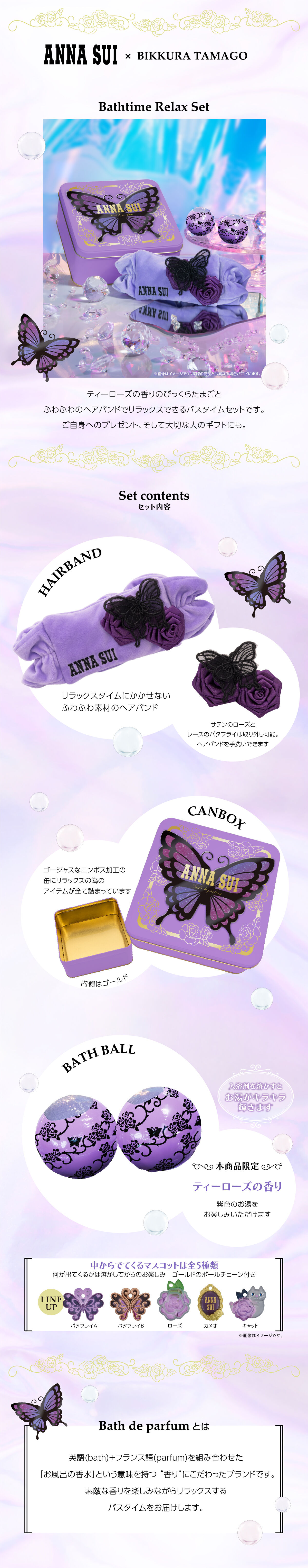 ✦••┈┈┈••✦••┈┈┈••✦ ANNA SUI×びっくらたまご バスタイムリラックスセットが登場! ✦••┈┈┈••✦••┈┈┈••✦ ティーローズの香りでお湯に溶かすと湯面が輝くびっくらたまご(バスボール)とヘアバンド、そしてオリジナルデザイン缶がセットになったバスタイムを特別にするリラックスの為のセットが登場。 ご自身へのプレゼント、大切な方への贈り物にも。 ●商品詳細 ANNA SUI×びっくらたまご コラボレーション商品が登場します。 入浴剤の香りは限定のティーローズの香り。 紫色のお湯には、マイカが配合されているため湯面がキラキラと輝きます。 入浴剤が溶けると、クリアなマスコットが1つ出てきます。 バタフライA,バタフライB,ローズ,カメオ,キャットの全5種類。 ゴールドのボールチェーン付きで、お手持ちのポーチ等につけることが出来ます。 ここでしか手に入らないヘアバンドはふわふわ素材を使用。サテンのローズとレースのバタフライがポイントとなっています。 素敵なバスタイムとリラックスタイムをお過ごしの後は、オリジナルデザイン缶に、お好きなものを入れてお使いください。 ●Bath de parfumとは 英語(bath)+フランス語(parfum) を組み合わせた「お風呂の香水」という意味を持つ“香り”にこだわったブランドです。 お風呂あがりにパルファムの香りをまとい、素敵な女性に。 素敵な香りを楽しみながらリラックスするバスタイムをお届けします。 ✦••┈┈┈••✦••┈┈┈••✦ ●入浴剤(浴用化粧料) 形状:丸型 香り:ティーローズのかおり 色 :紫色 容量:75g お湯に溶かすと湯面がキラキラ輝きます(マイカ入り) ●ラインナップ(全5種) ・バタフライA ・バタフライB ・ローズ ・カメオ ・キャット ※入浴剤1つにつき、いずれかひとつが入っています。 ※マスコットの種類は選べません。 【セット内容】 ・オリジナルデザイン缶1点 ・オリジナルデザインバスヘアバンド1点 ・びっくらたまご(バスボール)2点 ・マスコット用ゴールドボールチェーン2点 【製品素材】 ・オリジナルデザイン缶 :ブリキ ・ヘアバンド(へアバンド本体・コサージュ・刺繍蝶々) :ポリエステル ・バスボール :個装フィルム PE シュリンク PET ・マスコット :MABS 【サイズ】 ・オリジナルデザイン缶 外寸:約W180×D180×H80mm ・ヘアバンド 全長:約240mm 【ご注文受付数】 1注文につき12個まで 【生産エリア】 中国 ※準備数に達した場合、販売を終了させていただくことがあります。 ※ページにアクセスした時点で販売が終了している場合があります。 ※掲載している写真は開発中のため、実際の商品とは多少異なる場合があります。 ※同梱されているバスボールは、25年11月発売「びっくらたまご Bath de parfum ANNA SUI」と同一の内容です。 |