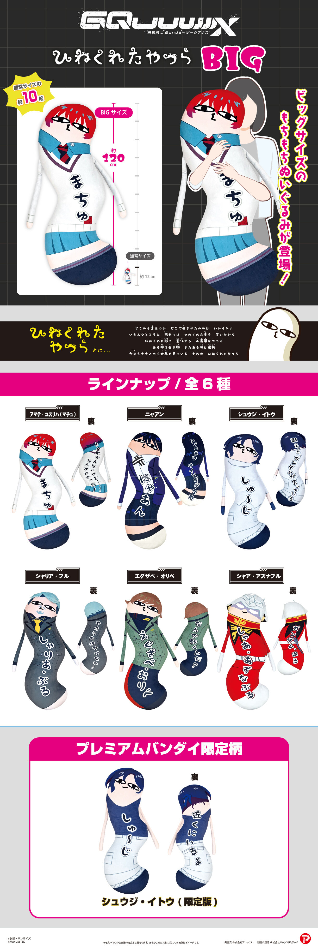 『機動戦士Gundam GQuuuuuuX(ジークアクス)』デザインの【ひねくれたやつら】が大きくなって新登場! ひねくれた体で劇中のセリフなどをゆる〜く背負い、『機動戦士Gundam GQuuuuuuX(ジークアクス)』のキャラクター達になりきった もちもち素材で120cmサイズのBIGぬいぐるみ、「ひねくれたやつらBIG」が全7種で登場! プレミアムバンダイ限定商品として【シュウジ・イトウ(限定版)】がラインナップ! 【ひねくれたやつら】とは どこから来たのか どこで生まれたのかは わからない いろんなところに 現れては ひねくれた事を 言いながら ひねくれた形に 変化する 不思議なやつら ある時は生き物 またある時は建物 今日もナナメから世界を見ている それが ひねくれたやつら ※本商品は監修中の為、実際の商品と画像とは多少異なりますのでご了承ください。 【商品名】機動戦士Gundam GQuuuuuuX(ジークアクス) ひねくれたやつらBIG <ラインナップ> アマテ・ユズリハ(マチュ)、ニャアン、シュウジ・イトウ、シャリア・ブル、エグザベ・オリベ、シャア・アズナブル <プレミアムバンダイ限定商品> シュウジ・イトウ(限定版) 【価格】13,200円(税込) 【種類数】全7種(うち1種はプレミアムバンダイ限定商品) 【本体サイズ】全長約120cm 【本体材質】ポリエステル 【対象年齢】15才以上 【商品の取り扱い】全国ホビー店、アニメ雑貨専門店での取り扱いがございます。 ※プレミアムバンダイ発送分は25年12月発送予定となりますが、 一部店舗では、25年11月中に店頭に並ぶ場合がございます。 【発売元】株式会社プレックス ※画像と実際の商品は多少異なる場合がございます。 ※本商品は準備数に限りがございます。準備数に達した場合、早期にご注文の受付を終了させていただくことがございます。 ※注文期間は予告なく変更となる場合があります。 |
