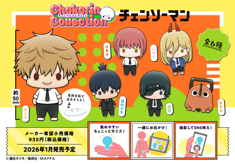 『ちょこりんマスコット』が『ちょこりんコレクション』に ちょこっとブランドリニューアル!アニメ『チェンソーマン』が再登場です。 ゆるっとしたデフォルメ感と、ちょこっとサイズが可愛いマスコット「ちょこりん」をコレクションしていこう! 一緒におでかけしたり、写真を撮ったり、様々なシチュエーションで楽しむことができるアイテムです。 付属の専用台座で自立も可能です。 ※全6種がセットになった商品でございます。 @デンジ Aマキマ Bパワー C早川アキ D姫野 Eポチタ ------------------------------------------------------------------------------------------------ 【セット内容】 ・彩色済み完成品フィギュア…6 ・専用台座…6 【商品素材】 PVC、ABS 【対象年齢】 15才以上 【商品サイズ】 各種全高約50mm 【ご注文受付数】 お一人様3個まで ※ご注文1回につき、3個購入可。 【決済方法】 クレジットカード(出荷時決済)、Amazon Pay、 PayPay、プレバンPay、あと払い(ペイディ)のみのお取り扱いとなります。 【商品の取り扱い】 プレミアムバンダイ、全国のホビーショップ、Web通販サイト 【作品名】 チェンソーマン 【発売元】 株式会社メガハウス ------------------------------------------------------------------------------------------------ ※写真は開発中のものです。 デザイン・仕様は変更になる場合がございますのであらかじめご了承下さいませ。 ※本商品は、他商品と同時にご購入いただくことはできません。 ※ご注文後のキャンセルは、一切お受けできません。 ※生産上の都合により、お届け日が変更となることがございます。あらかじめご了承下さい。 ※注文期間は予告なく変更となる場合があります。 ※本商品は準備数に限りがございます。準備数に達した場合、早期にご注文の受付を終了させて いただくことがございます。 ※ご要望多数の場合、お届け時期を変更し、再度受注を行うことがございます。 ※本商品は、イベントや他の企画および海外等で販売をさせていただく場合がございます。 ※送料・お届けは、全国一律770円(税込み)です。 ------------------------------------------------------------------------------------------------ |