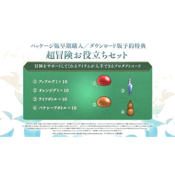 商品詳細 シリーズ15周年記念タイトルとして2011年に発売し、初のダブル主人公を実現した「テイルズ オブ エクシリア」がリマスターとして復刻。 医学生の少年「ジュード」と、精霊の主マクスウェルを名乗る謎の女性「ミラ」。 2人の主人公の想いが重なる時、揺るぎなき信念が未来を切り開く―― 人間と精霊が共生する世界「リーゼ・マクシア」を舞台に繰り広げられる壮大な物語体験、仲間と“つながる力”をテーマにした戦略性の高いバトルシステム、個性あふれるキャラクターたちで紡がれる数々の群像劇。 グラフィックの向上に加え、ゲーム進行をサポートする便利機能の追加、オリジナル版のDLCを多数収録など、更に遊びやすくなった「エクシリア」の世界を是非お楽しみください。 【通常版 内容物】 ・本編 【対象年齢】 12歳以上 【ご注文受付数】 お一人様1個まで 【注意事項】 ※本製品をプレイするには、ゲーム内に表示されるサービス利用規約に同意する必要があります。 詳しくは(https://www.bandainamcoent.co.jp/cs/kiyaku/eula/)をご確認ください。 ※画像は開発中のものです。実際の製品とは異なる場合があります。 ※商品ご購入の際は必ずこちらをお読みください。 【各アイテム仕様】 ・いのまたむつみ先生・藤島康介先生描きおろし シリアルナンバー入りキャラファイングラフ 素材:本体素材/紙、額素材/木製・アクリル、プレート/アルミ サイズ:約W338mm×H425mm×D20mm 生産エリア:日本 ・メッセージカード 素材:紙 サイズ:約W147mm×H100mm 生産エリア:日本 ・アクリルジオラマ 素材:アクリル サイズ:約W153mm×H90mm×D40mm(組立時) 生産エリア:日本 ・イラストカード 8枚セット 素材:紙 サイズ:約W148mm×H100mm 生産エリア:日本 ・ピンバッジ 3個セット 素材:本体/ステンレス、針/真鍮 サイズ:約W30mm×H30mm内(単体) 生産エリア:中国 ・フレークシール 13枚セット 素材:紙 サイズ:約W37mm×H31mm内(単体) 生産エリア:中国 【共通注釈】 ※各商品のアイテムは対象年齢15才以上のアイテムを同梱しております。対象年齢未満のお子さまの利用には適しておりませんのでご購入の際はご注意ください。 ※内容・名称・仕様は予告無く一部変更になる場合がございます。 ※画像はイメージです。実際のものとは異なる場合がございます。 ※数量限定につき、受注期間内であっても販売予定数に達し次第販売終了とさせていただきます。予めご了承ください。 ※同梱物は生産工程上、小さな汚れや傷等が生じる場合がございますが、弊社側で検品の上、製品仕様の範囲内と判断した製品をお送りしております。交換希望の場合、弊社判断にて交換をお断りさせていただく場合がございます。 ※同梱物は後日販売・配布される可能性がございます。 ※破損、変形、故障した場合はご使用をおやめください。 ※製品ではない、箱、ビニールなどの商品に付属する保護材の破れ・破損に関しては、交換をお断りしておりますのでご了承ください。 ※陸送・空輸となりますので、配送状況次第で予定日より配送が遅れる場合もございますので、あらかじめご了承ください。 ※ピンバッジ 3個セットにはデザイン上鋭利な部位があります。お取り扱いにはご注意ください。また、誤飲にご注意ください。 【超特装版・アイテムのみ】 ※キャラファイングラフのシリアルナンバーは、お選びいただくことはできません。 また配送時の破損等により交換対応を行った場合、同じシリアルナンバーでの交換はいたしかねます。 ※アイテムのみの商品にゲーム本編は付属いたしませんのでご注意ください。 【早期購入特典】 ※本特典はパッケージ版/ダウンロード版共通の特典となります。 ※すべてゲーム内アイテムとして反映されます。実際に付属するものではございません。 ※パッケージ版の特典が封入されている製品にはシュリンク(外装フィルム)のパッケージ表面にシールが貼付されております。なくなり次第終了となりますので、あらかじめご了承ください。 ※パッケージ版に付属する特典コードは1回のみ使用可能で有効期限があります(2026年10月29日23:59まで)。 ※本特典をご利用いただくには、ゲーム機本体をインターネットに接続する環境が必要です。また、Nintendo Switch™版はニンテンドーeショップ、PlayStation®5版はPlayStation™Networkへのアクセスが必要です。 ※本特典をご利用いただくには、最新バージョンへアップデートする必要があります。 ※本特典はゲーム起動後、メニュー>アイテム>EXTRAから解放して有効化することで反映されます。 ※「超冒険お役立ちセット」は重複して入手できません。複数購入しても、入手可能な個数は1セットのみとなります。 【PKG版購入特典】 ※ジャケット中面にデザインがございます。 【ASOBI STORE購入特典:A3半裁ポスター6枚セット】 サイズ:約W148mm×H420mm ※特典には数に限りがございます。無くなり次第終了とさせていただきますのであらかじめご了承ください。 ※配送の過程にて、傷や折れが付く場合がござ