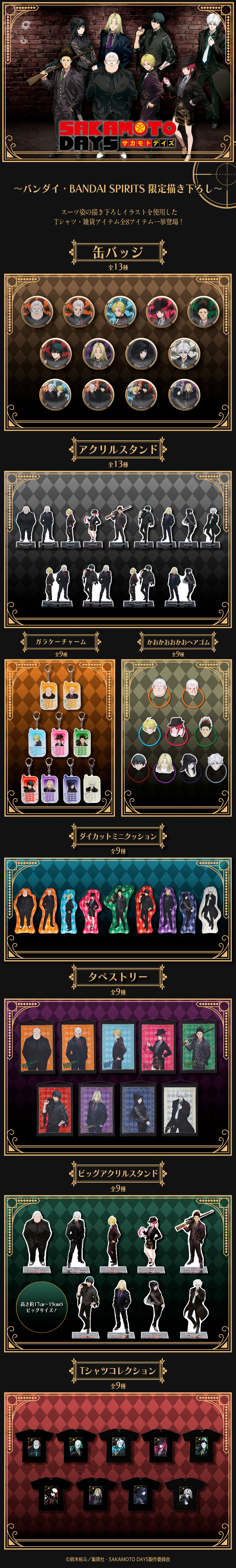 上限数に達し次第、受注を終了させていただきます。 TVアニメ『SAKAMOTO DAYS』より、坂本 太郎・朝倉 シン・陸 少糖・眞霜 平助・南雲・神々廻・大佛・X(スラー)がスーツ姿で集結! バンダイ・BANDAI SPIRITS限定描き下ろしイラストです。 デスクに飾って楽しめるアクリルスタンドです! ●商品情報 ■素材 :アクリル ■生産エリア:日本 ■サイズ 坂本 太郎A:約W57×H122mm 坂本 太郎B:約W42×H122mm 朝倉 シン:約W29×H114mm 陸 少糖:約W49×H112mm 眞霜 平助:約W72×H124mm 南雲:約W46×H123mm 神々廻:約W38×H116mm 大佛:約W42×H114mm X(スラー):約W50×H116mm 坂本 太郎B & 朝倉 シン:約W70×H122mm 坂本 太郎B & 南雲:約W85×H123mm 南雲 & 朝倉 シン:約W72×H123mm 神々廻 & 大佛:約W80×H116mm 台座:約W56×H33mm 台座(ペア):約W88×H33mm ■対象年齢 :15歳以上 ※描き下ろしイラストは本商品用の限定のイラストではございません。予めご了承下さい。 ※種類はお選びいただけません。予めご了承ください。 ※お届け時期を変更し、ご注文を承る場合がございます。 ※準備数に達した場合、早期に販売を終了させていただくことがございます。 ※商品仕様等は予告なく変更になる場合があります。 ※掲載している写真は開発中のため、実際の商品とは多少異なる場合があります。 |