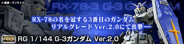 R X - 7 8 の 名 を 冠 す る 3 番 目 の ガ ン ダ ム リ ア ル グ レ ー ド V e r . 2 . 0 に て 出 撃 ー 「RX-78」の型式番号を持つ機体のうちマグネットコーティング処理を施した3番目の機体、G-3ガンダムがリアルグレード Ver.2.0で出撃。 本機体を象徴するマグネットコーティングが施されている、肘・膝・アンクルガードの丸いディティール部分を新規造形。 リアルグレード特有の細部までこだわったデザインと広い可動域で様々なポージングが可能。