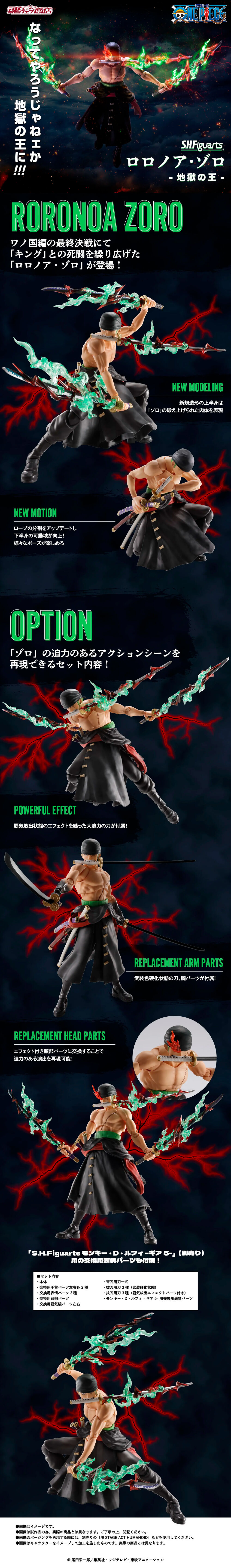 アクションフィギュアシリーズS.H.Figuartsに「ロロノア・ゾロ -地獄の王-」が登場! TVアニメ『ONE PIECE』より、鬼ヶ島最終決戦時の「ロロノア・ゾロ」が登場! 武装色の覇気をイメージした交換用腕パーツに加え、刀身に纏う大迫力のエフェクトパーツが付属! |