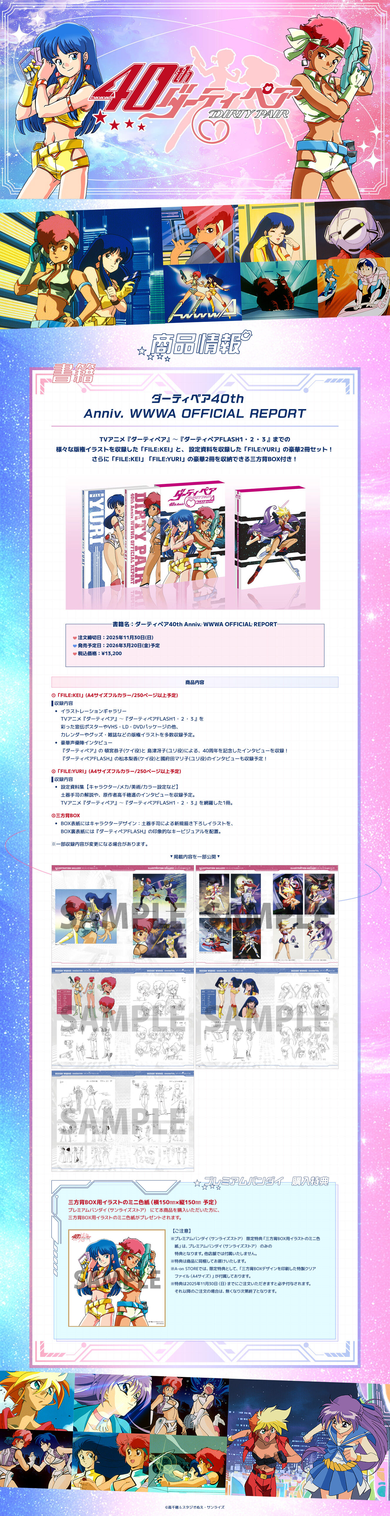 ※撮影環境やご利用のモニター環境により、実物と多少異なって見える場合がございます。 TVアニメ『ダーティペア』40周年を記念して、設定資料集「ダーティペア40th Anniv. WWWA OFFICIAL REPORT」が登場! 【プレミアムバンダイ オリジナル特典】