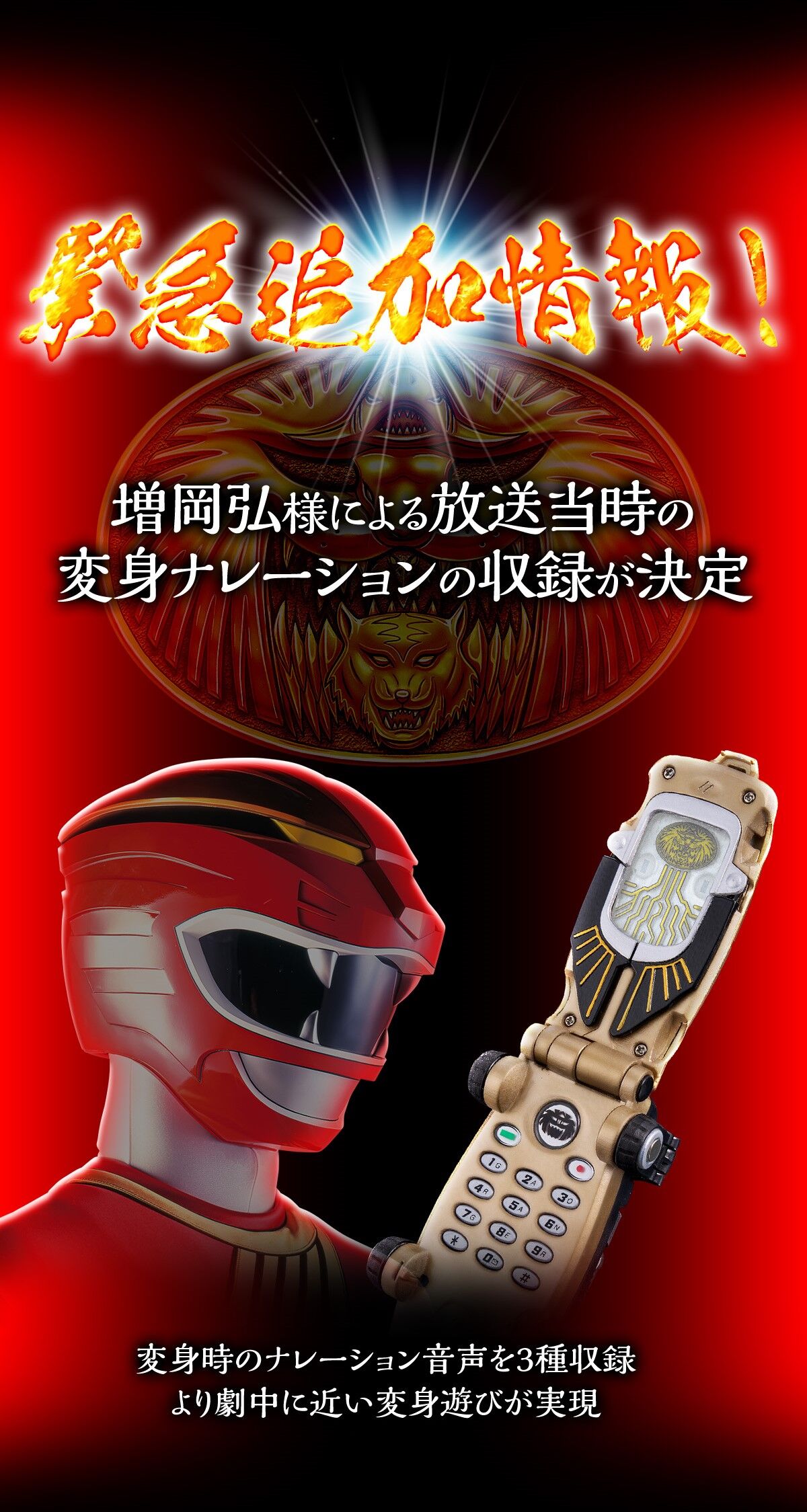商品説明 『百獣戦隊ガオレンジャー』より、変身アイテム「Gフォン」をMEMORIAL EDITIONとして初商品化いたします。セットにはGフォン本体とアンテナヘッドが5種付属。5人のガオレンジャー各メンバーの形態を再現可能です Gフォン本体には、新たにモーションセンサを搭載。変身シークエンスでは、ボタン操作のほかにGフォンを振る動作にも合わせて効果音が発動します。Gフォン画面部分のLEDはDX版の2灯から4灯に増加。より劇中イメージに合わせた発光演出を実現いたしました。変身後には印象的な名乗り時の効果音も発動可能です。 さらにGフォン本体のキー入力により、様々な音声が発動可能。BGMは主題歌「ガオレンジャー吼えろ!!(TVサイズ)」など複数を収録し、効果音も「パワーアニマル咆哮音」や「破邪百獣剣 攻撃音」などをはじめ多数収録しています。 本体造形はDX版をベースに新規で造形。パーツを引き出すことでアニマルモードやヒーローモードへの変形も可能です。関節部にはダイキャストを使用し、重厚感あふれる仕上がりとなっています。 セット内容 Gフォン…1 アンテナヘッド…5種各1