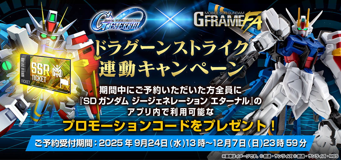 MS(モビルスーツ)が持つフォルムの美しさとポージングの楽しさ、そのどちらも堪能できる食玩「GフレームFA」に、 シミュレーションアプリ『SDガンダム ジージェネレーション エターナル』より「ドラグーンストライク」が初立体化! ドラグーンストライカーを完全新規で造形し、3基のドラグーンとバッテリーパックは戦闘演出に合わせて着脱可能! さらに、期間中「機動戦士ガンダム GフレームFA ドラグーンストライク」をご予約いただいた方全員に『SDガンダム ジージェネレーション エターナル』の アプリ内で利用可能な「SSR以上確定ガシャチケット×1」「称号:DRAGOON System」「プレミアムガシャチケット×1」が入手できるプロモーションコードをプレゼント! ※詳しくはドラグーンストライク連動キャンペーンページをご覧ください。