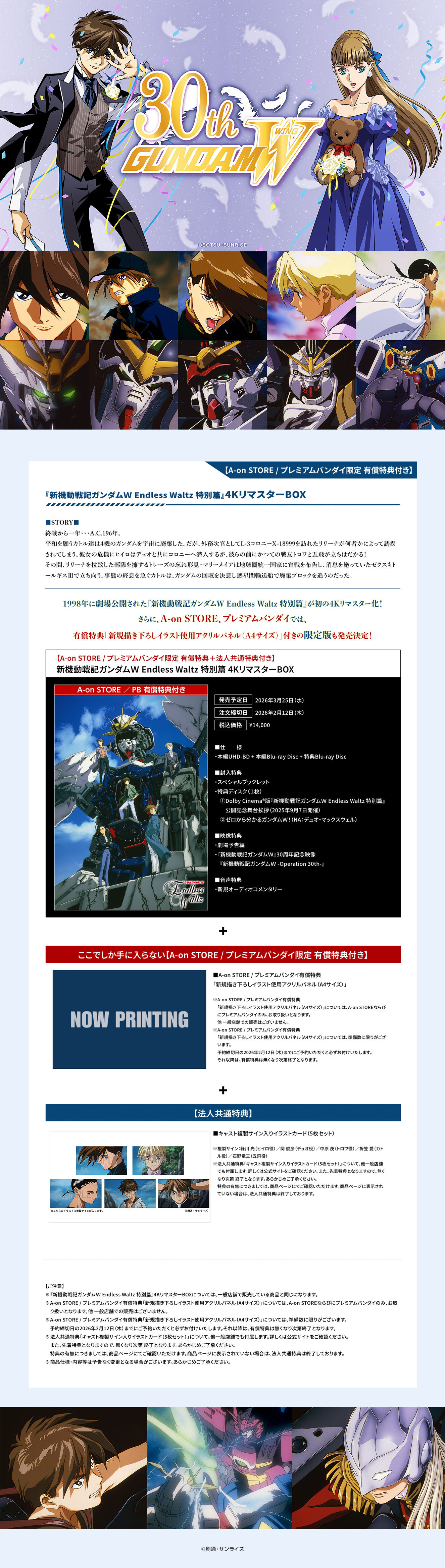 ![]() 1998年に劇場公開された『新機動戦記ガンダムW Endless Waltz 特別篇』が初の4Kリマスター化! 【収録内容】 終戦から一年・・・A.C.196年。 平和を願うカトル達は4機のガンダムを宇宙に廃棄した。だが、外務次官としてL-3コロニーX-18999を訪れたリリーナが何者かによって誘拐されてしまう。彼女の危機にヒイロはデュオと共にコロニーへ潜入するが、彼らの前にかつての戦友トロワと五飛が立ちはだかる! その間、リリーナを拉致した部隊を擁するトレーズの忘れ形見・マリーメイアは地球圏統一国家に宣戦を布告し、消息を絶っていたゼクスもトールギスIIIで立ち向う。事態の終息を急ぐカトルは、ガンダムの回収を決意し惑星間輸送船で廃棄ブロックを追うのだった。 【封入特典】 ■スペシャルブックレット ■特典ディスク(1枚) (1)Dolby Cinema(R)版『新機動戦記ガンダムW Endless Waltz 特別篇』公開記念舞台挨拶(2025年9月7日開催) (2)ゼロから分かるガンダムW!(NA:デュオ・マックスウェル) 【映像特典】 ■劇場予告編 ■『新機動戦記ガンダムW』30周年記念映像 『新機動戦記ガンダムW -Operation 30th-』 【音声特典】 ■新規オーディオコメンタリー 【A-on STORE / プレミアムバンダイ有償特典】 ■新規描き下ろしイラスト使用アクリルパネル(A4サイズ) 【法人共通特典】 ■キャスト複製サイン入りイラストカード(5枚セット) ※複製サイン:緑川 光(ヒイロ役)/関 俊彦(デュオ役)/中原 茂(トロワ役)/折笠 愛(カトル役)/石野竜三(五飛役) <スタッフ> 製作:吉井孝幸/企画:植田益郎・渡辺 繁/原作:矢立 肇・富野由悠季(「機動戦士ガンダム」より)/監督:青木康直/脚本:隅沢克之/キャラクターデザイン:村瀬修功/衣裳デザイン協力:出渕 裕/メカニカルデザイン:大河原邦男・カトキハジメ・石垣純哉/作画監督:菱沼義仁/メカニカル作画監督:筱 雅律/美術監督:佐藤 勝/色彩設計:池 さゆり・片山由美子/撮影監督:大神洋一/編集:辺見俊夫/音楽:大谷 幸/主題歌:「LAST IMPRESSION」written by永野椎菜/composed by高山みなみ/ProducedPerformed byTWO-MIX(キングレコード)/音響監督:浦上靖夫/プロデューサー:富岡秀行・久保 聡・湯川 淳/製作協力:バンダイビジュアル(現:バンダイナムコフィルムワークス)/企画・製作:サンライズ 他 <キャスト> ヒイロ:緑川 光/デュオ:関 俊彦/トロワ:中原 茂/カトル:折笠 愛/五飛:石野竜三/リリーナ:矢島晶子/サリィ:冬馬由美/ノイン:横山智佐/レディ・アン:紗 ゆり/デキム:依田英助/マリーメイア:佐久間レイ/ゼクス:子安武人/ドロシー:松井菜桜子/ナレーション:大塚明夫 他 ---------------------------- 【ご注文受付数】 1注文につき2個まで プレミアムバンダイ A-on STORE(バンダイナムコフィルムワークス公式ショップ) 他、一般店舗 ※本商品は、「新機動戦記ガンダムW Endless Waltz 特別篇 4KリマスターBOX」と、A-on STORE / プレミアムバンダイ 限定の有償特典「新規描き下ろしイラスト使用アクリルパネル」のセット商品となります。 ※「新機動戦記ガンダムW Endless Waltz 特別篇 4KリマスターBOX」については、一般店舗での取り扱いもございます。 ※「新規描き下ろしイラスト使用アクリルパネル」は、A-on STORE / プレミアムバンダイ 限定の有償特典となります。他 一般店舗での販売はございません。 ※「新規描き下ろしイラスト使用アクリルパネル」は、予約締切日(2026年2月12日(木))までにご予約いただくと、必ずお付け致します。 予約締切日以降は、有償特典は無くなり次第終了となります。 ※法人共通特典「キャスト複製サイン入りイラストカード(5枚セット)」は、他 一般店舗でも付属します。詳しくは公式サイトをご確認ください。 ※法人共通特典は先着特典となりますので、無くなり次第 終了となります。あらかじめご了承ください。 ※イベント会場や海外等で販売する場合があります。 ※本商品は準備数に限りがございます。準備数に達した場合、早期にご注文の受付を終了させていただくことがございます。 ※撮影環境やご利用のモニター環境により、実物と多少異なって見える場合がございます。 ※商品画像はイメージです。実際の商品仕様が異なる場合がございます。あらかじめご了承ください。 ※商品仕様・内容等は予告なく変更となる場合がございます。あらかじめご了承ください。 【発売元】 株式会社バンダイナムコフィルムワークス ※プレミアムバンダイでの本商品のお支払い方法は、『クレジットカード払い』、『WEBコンビニ決済(前払い)』、 『PayPay』、『プレバンPay』、『あと払い(ペイディ)』とさせていただいております。 ※「コンビニ決済」については、 ご注文日より4日以内に決済手続きが行われなかった場合は、自動的にキャンセルとなります。 いかなる理由でも、決済期間の延長は対応出来かねます。 ※お客様都合による決済後のキャンセルは出来かねます。 |