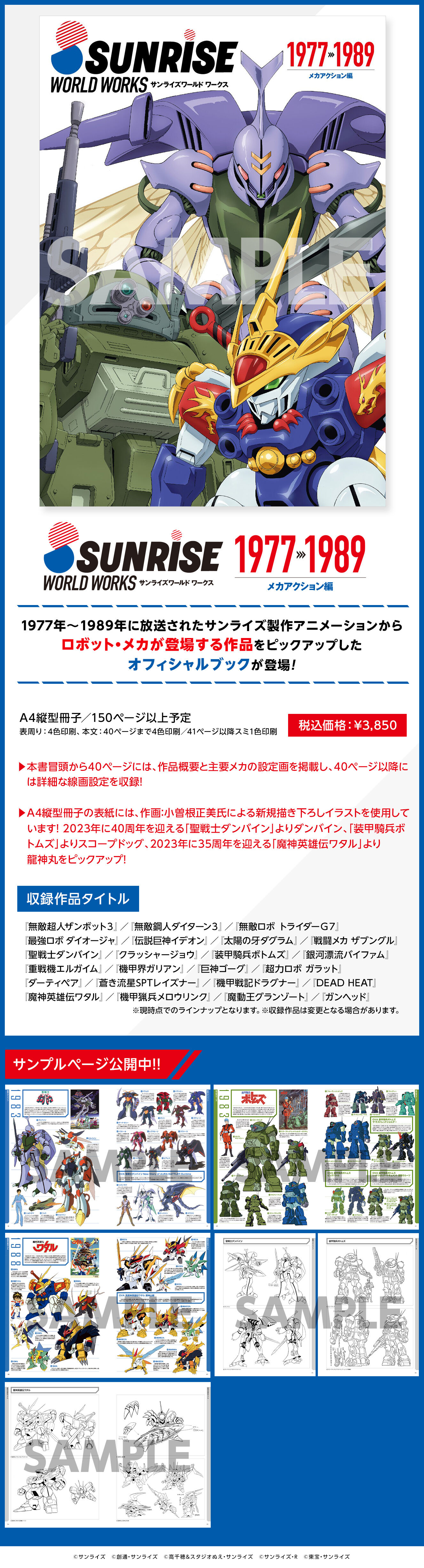 本書籍は、1977年〜1989年に放送されたサンライズ製作アニメーションからロボット・メカが登場する作品をピックアップしたオフィシャルブック。