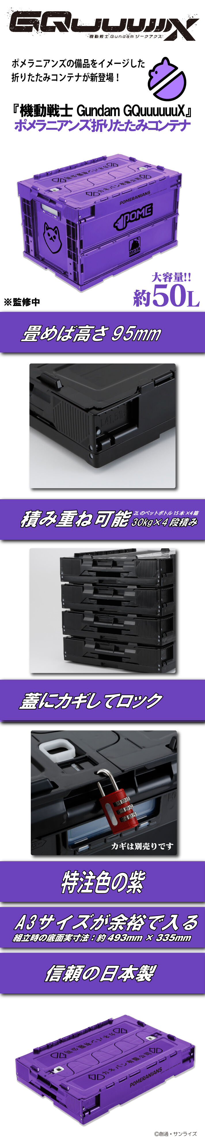 『機動戦士Gundam GQuuuuuuX(ジークアクス)』に登場した、クランバトルチーム「ポメラニアンズ」こと「カネバン有限公司」の事務所内の備品をイメージした折りたたみコンテナ!ロゴマークなどを配置し、まるで事務所内で使われている備品であるかの様なデザインとなっています。